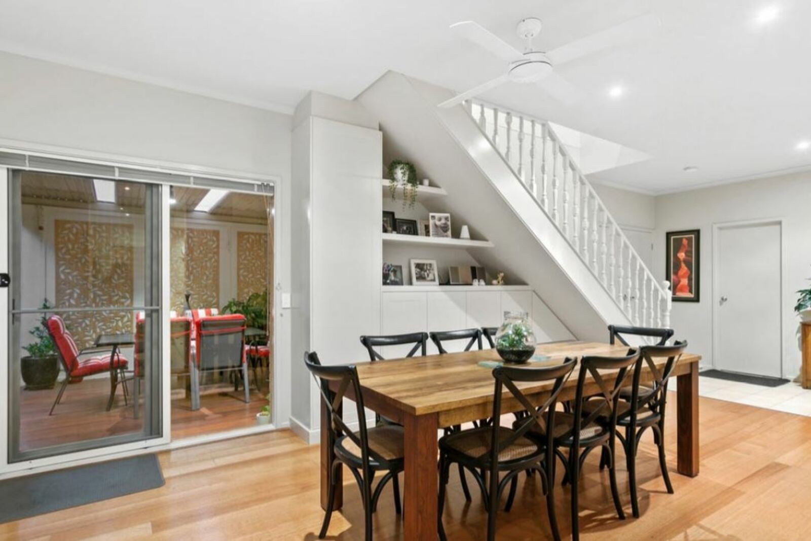 Sliding doors open to a private outdoor courtyard, providing a low-maintenance space ideal for outdoor dining or relaxing in privacy.