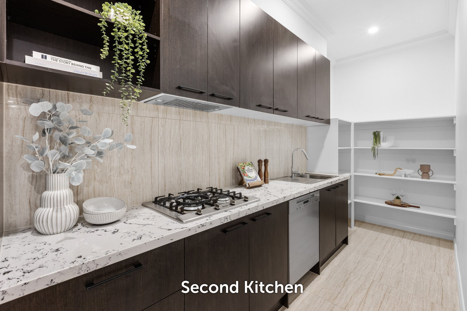 The heart of the home unfolds to a spacious open-plan living and dining domain, complemented by a designer kitchen appointed with premium appliances, expansive island bench, Butler’s pantry/Second Kitchen and excellent storage, seamlessly connecting to outdoor entertaining.