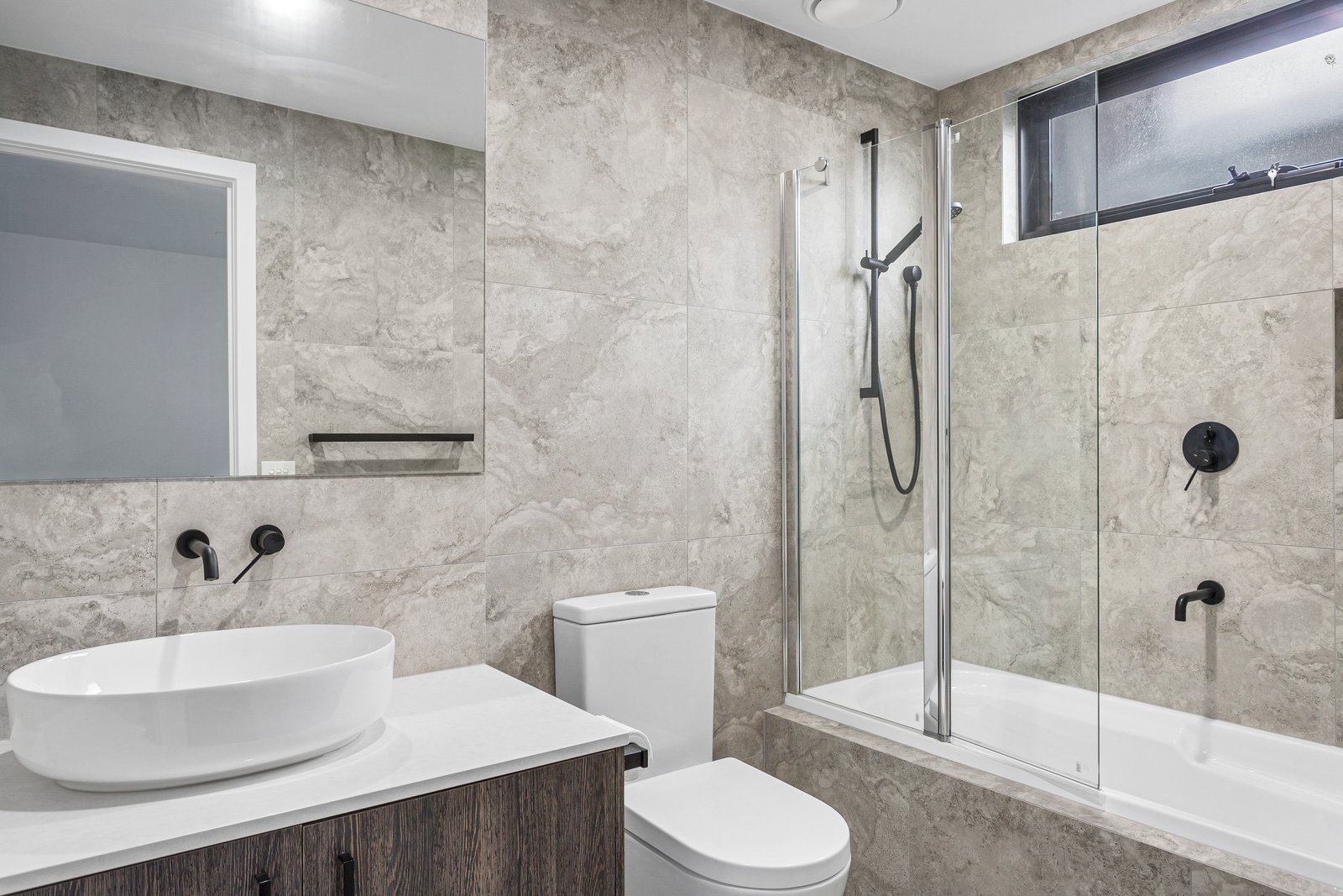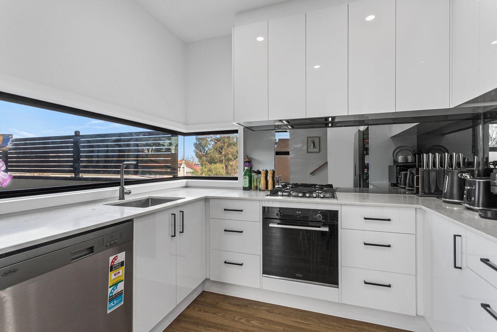 - Sleek Kitchen: Featuring soft-close cabinetry, a waterfall stone counter, a fan-forced oven, a gas cooktop, a dishwasher, a reflective splashback, and included in the lease is the fridge and washing machine.