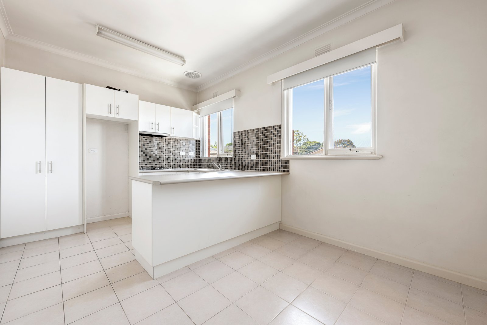 • Modern kitchen with adjoining meals space featuring ample storage
