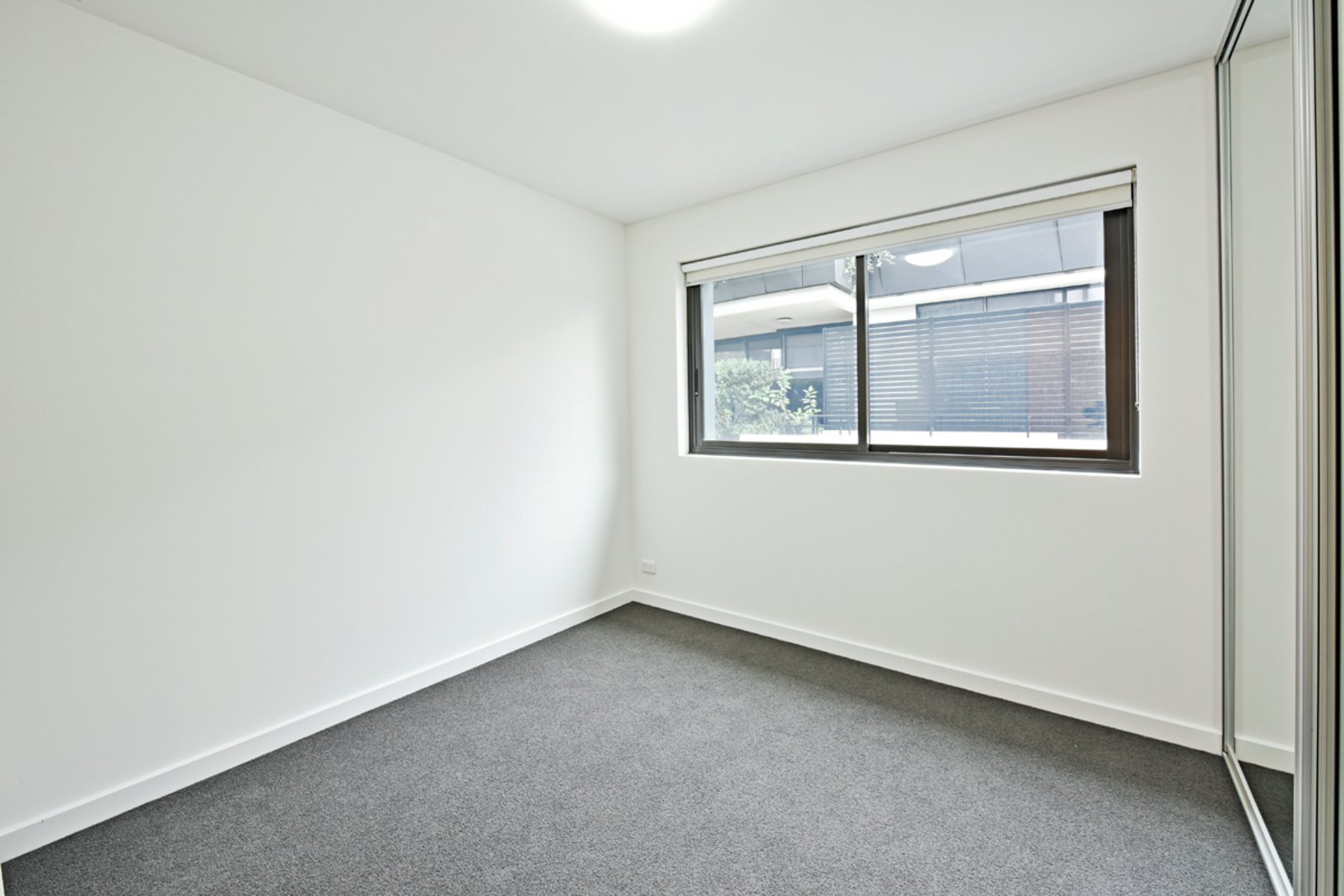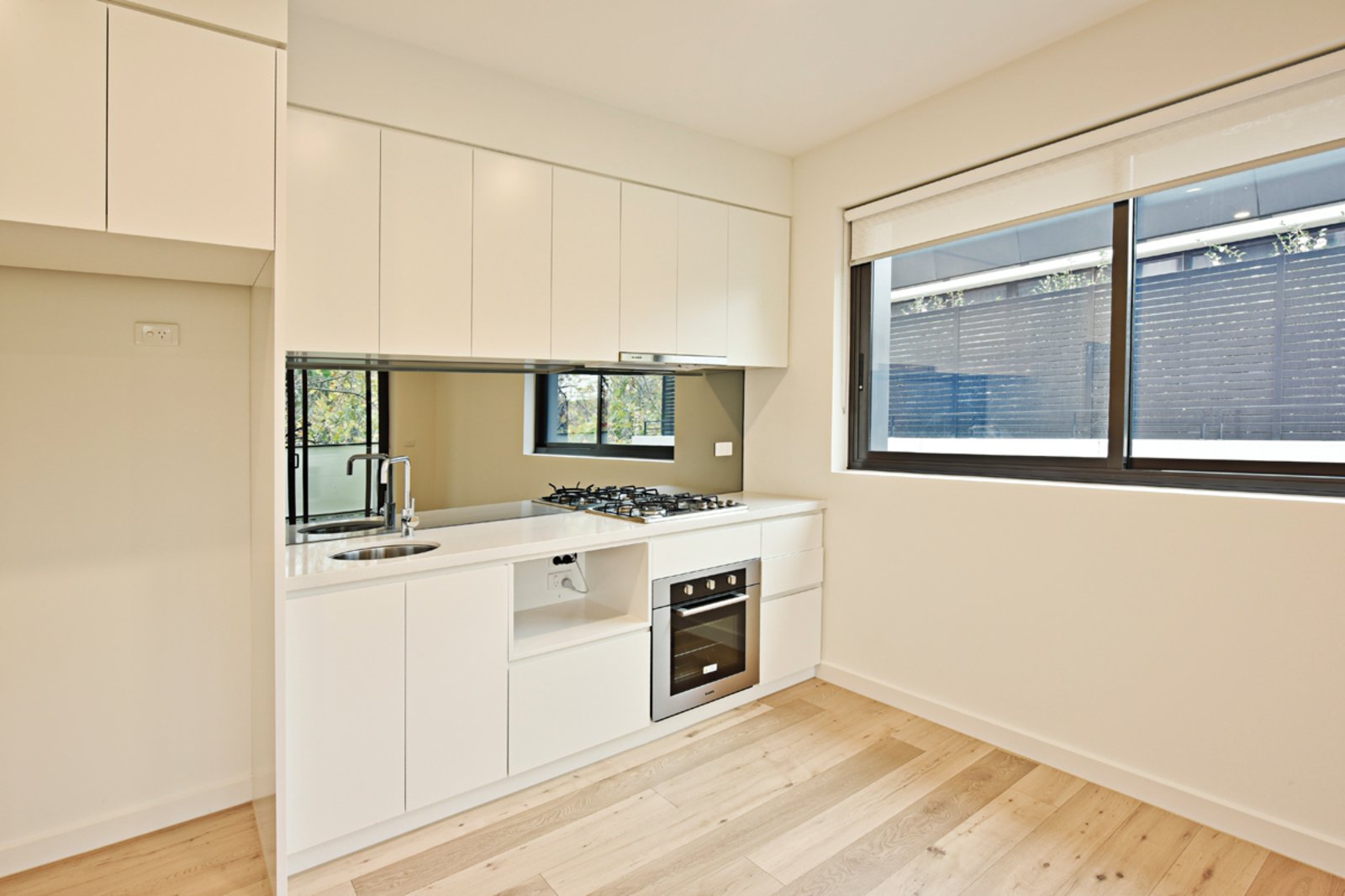 The home's interior boasts one bedroom with built in robes, a modern central bathroom, an open lounge/dining area, an adjoining contemporary kitchen featuring stone benchtops, soft close cabinetry, stainless steel cooking appliances and a Fisher & Paykel dishwasher, and a European laundry.