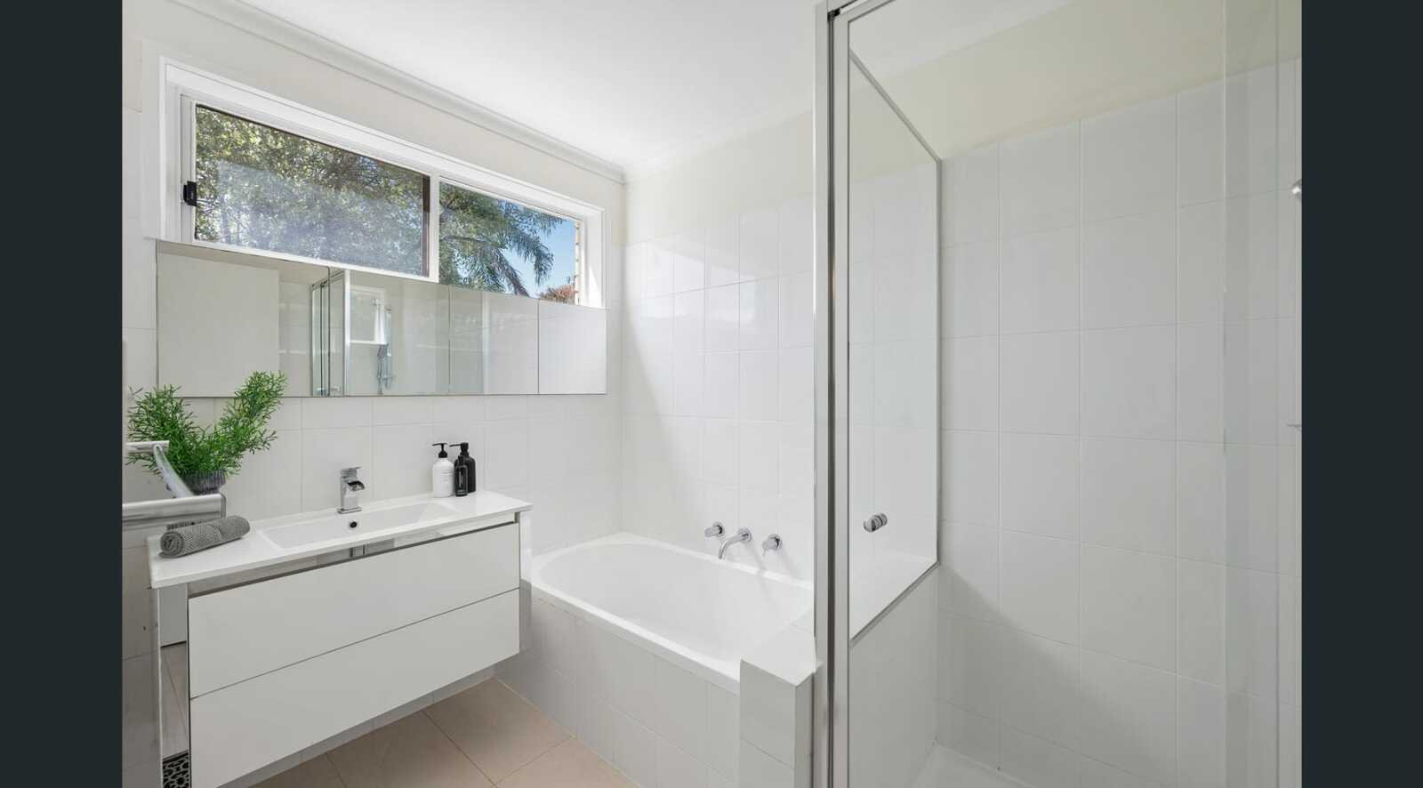 Each of the three bedrooms enjoys a leafy outlook and built-in robes, served by a bright, central bathroom defined by its crisp simplicity. The generous main bedroom is zoned for rear-facing serenity.