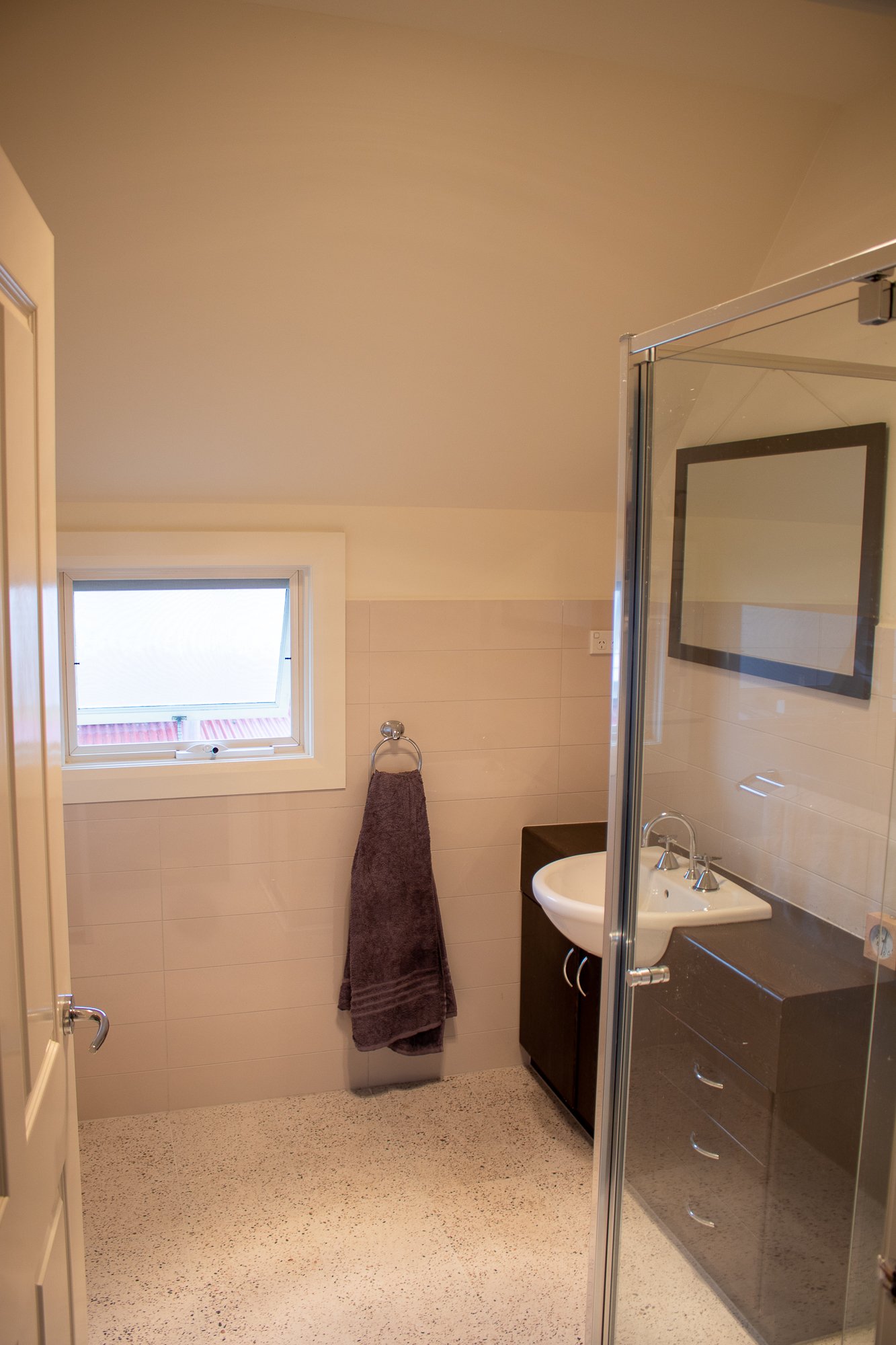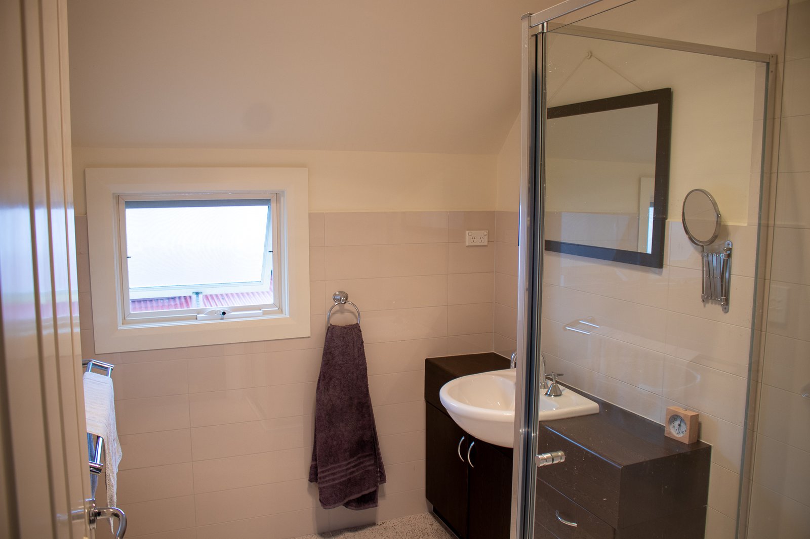 - Modern tiled bathroom featuring a shower