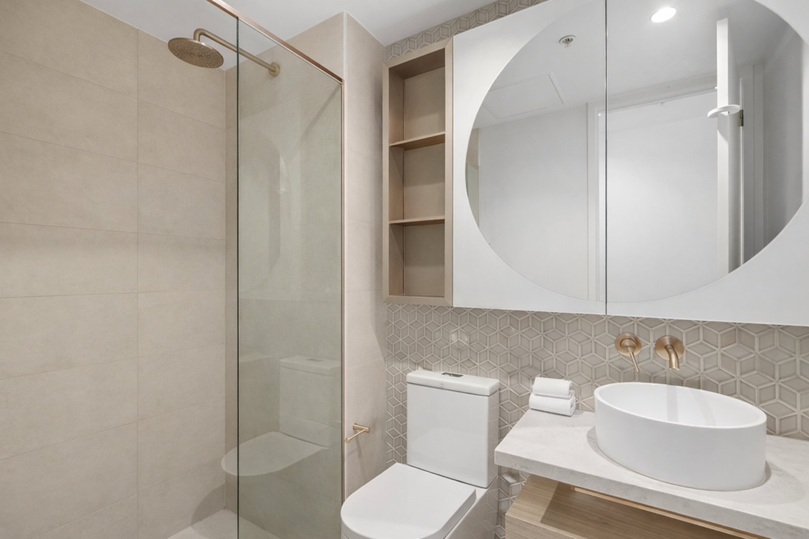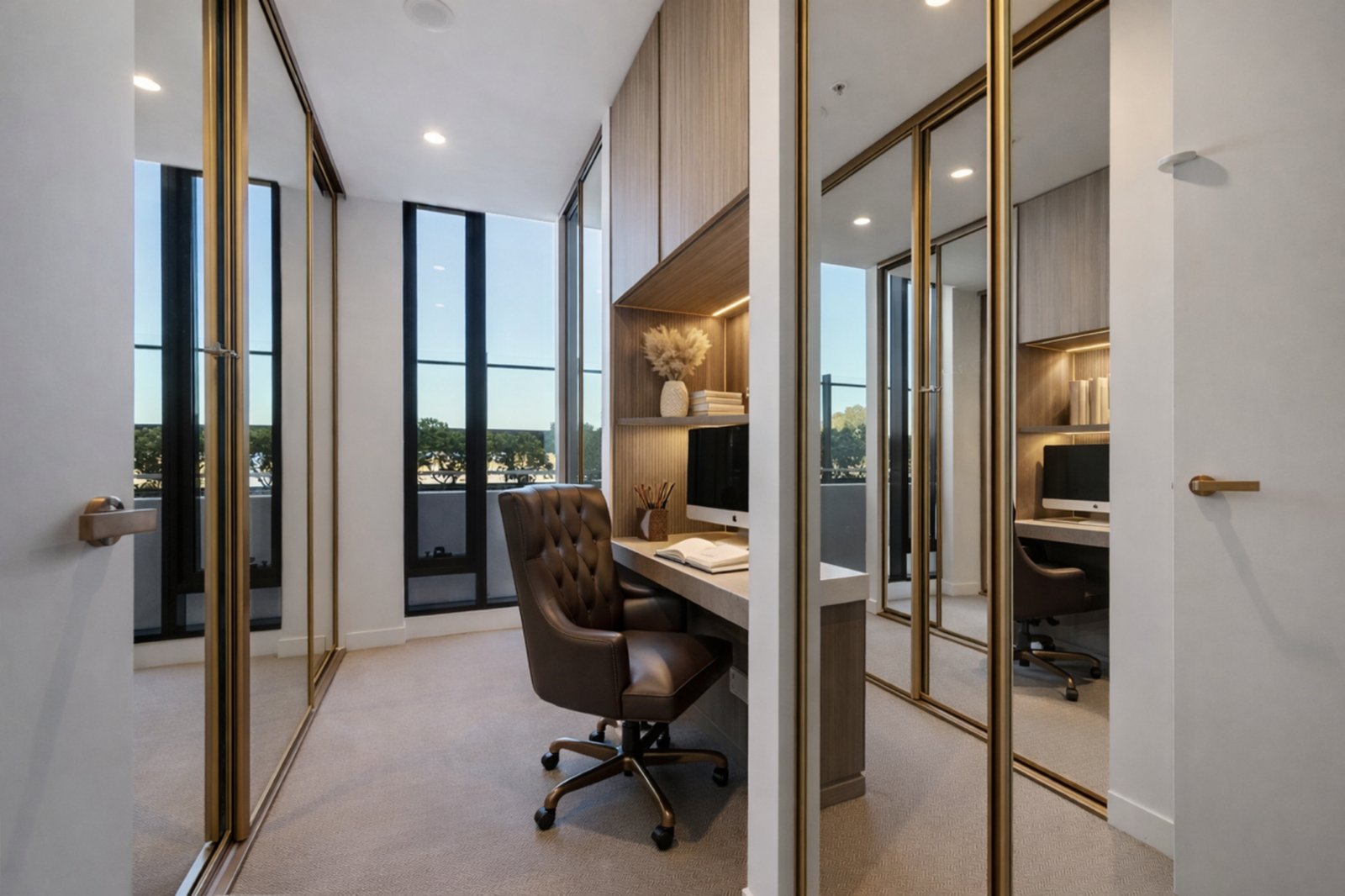 Both bedrooms include fitted robes, with the oversized main suite enjoying its balcony access and a beautifully appointed ensuite. A flexible third room, currently configured as a study or dressing room with additional robes, was originally a bedroom in the three bedroom plan and can readily be reinstated if desired. The kitchen presents clean contemporary lines with stone benchtops, custom joinery, quality appliances, champagne tapware and smoked glass detailing. A central bathroom with brushed gold finishes and rainfall shower, separate laundry room, secure car space and over bonnet storage complete the picture.