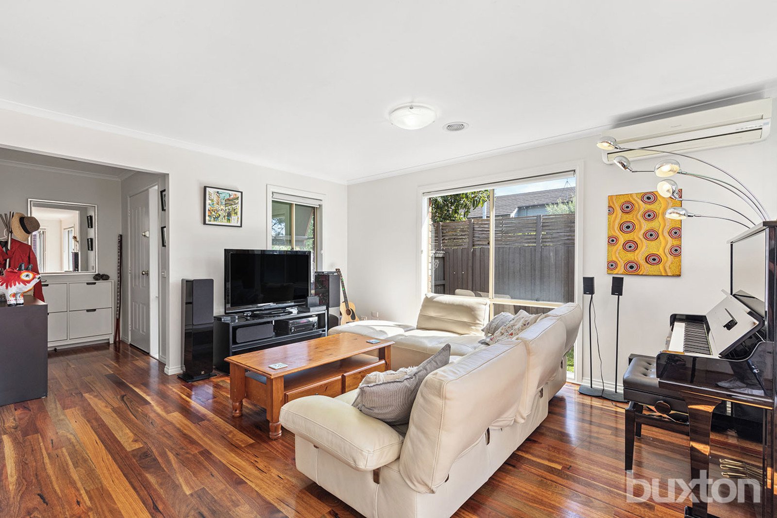 The open-plan living and dining area includes floorboards, split-system heating and cooling, and ducted heating throughout, with bi-fold doors opening to the deck and garden.