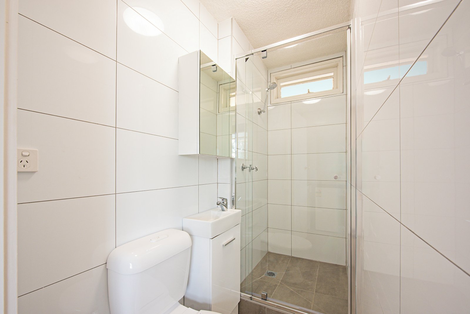 The renovated bathroom has under counter and shaving cabinet storage and sleek tiling throughout.
