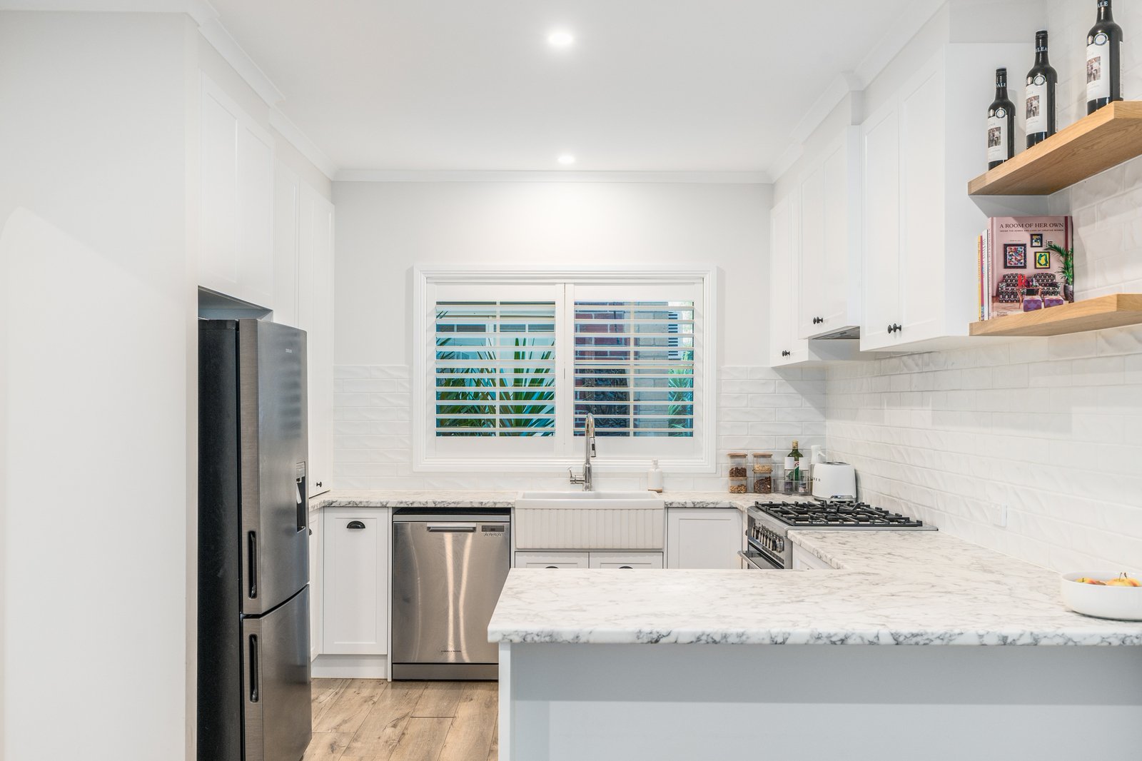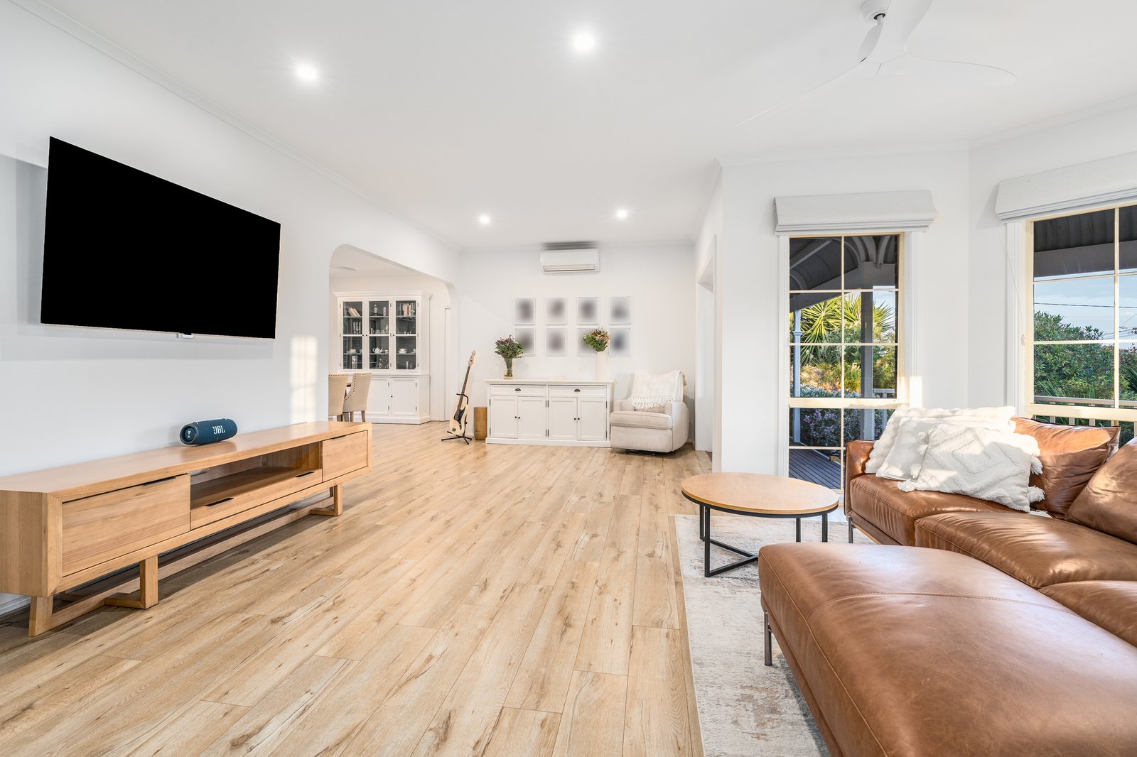 Light-filled and inviting, the home immediately impresses with its generous lounge and living area, framed by bay windows that capture natural light and picturesque views. French doors open to a paved terrace-style entertaining space, perfectly positioned to take in the stunning outlook. Year-round comfort is assured with multiple split-system air conditioners and ceiling fans throughout. The well-designed floorplan includes a master bedroom with walk-in robe and ensuite, while the stunning renovated central kitchen features a dishwasher, large 900mm oven, gas cooktop and ample storage. Two additional bedrooms with built-in robes are serviced by a large renovated bathroom with both bath and shower. Set on an approximately 641sqm allotment, the property also offers established private gardens, a long driveway leading to a double lock-up garage, and a flat grassed area to the side, ideal for children, pets or future landscaping potential.