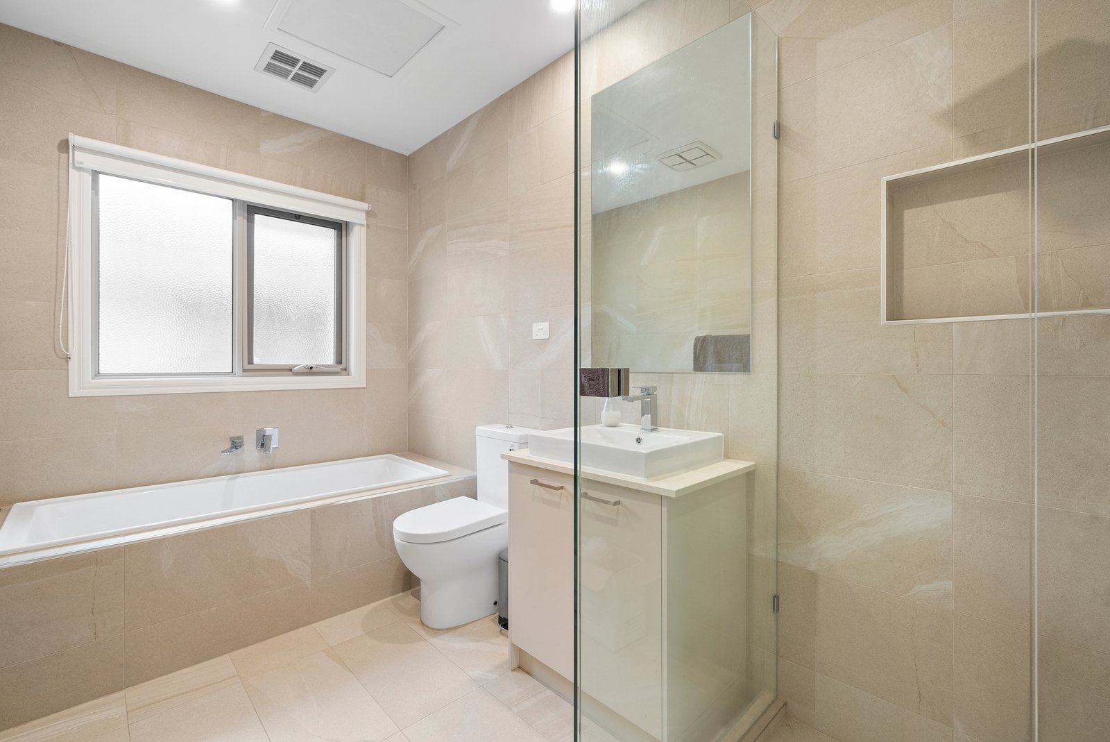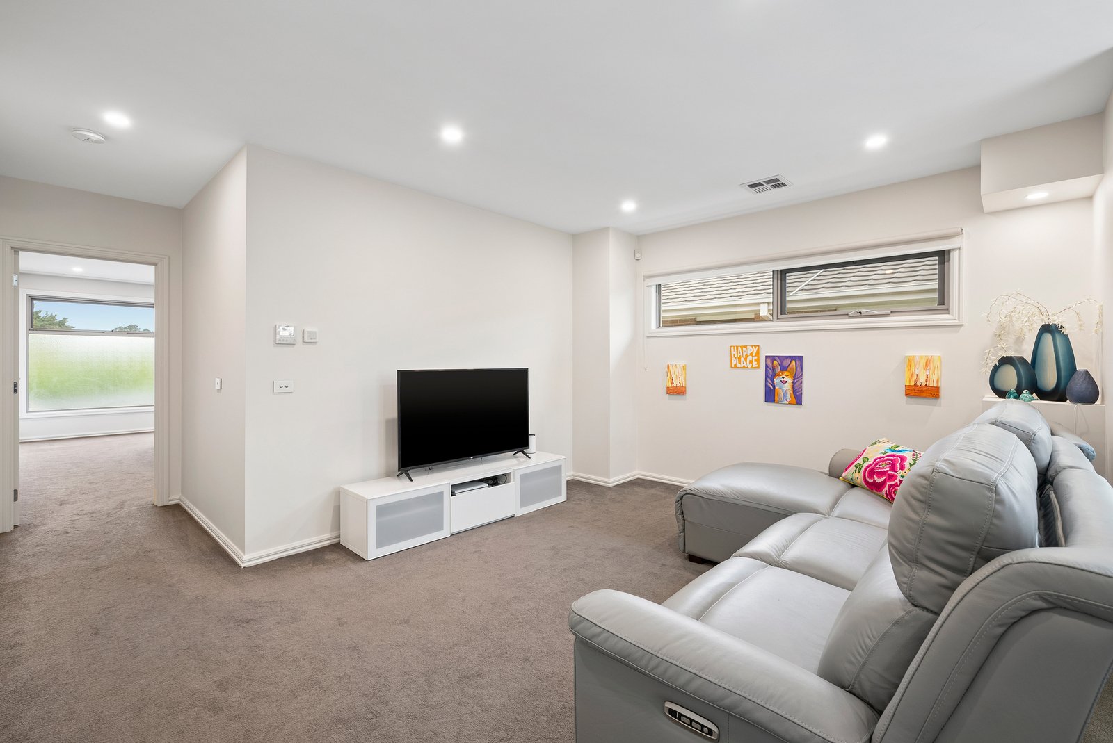 Upstairs, the privately zoned main bedroom features a wall-to-wall walk-in robe with custom storage and sliding glass doors, paired with a luxurious ensuite. Two further bedrooms with bespoke glass panel robes are serviced by a stylish central bathroom with freestanding bath, while a separate rumpus room provides flexibility for the family. There is ample storage throughout this property.