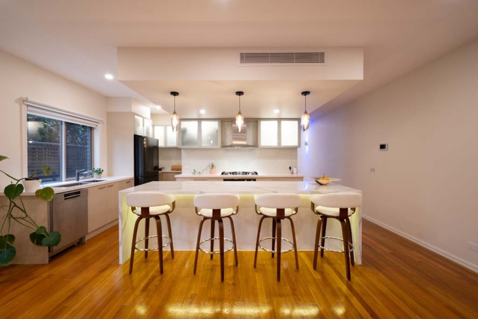 Expansive, custom open-plan living and dining zones are designed for seamless indoor–outdoor enjoyment, with fully opening double-glazed bi-fold doors extending to side and rear entertaining decks that feature in-built led lighting and private garden. The designer kitchen is a true centrepiece, showcasing a generous 3-metre Calacatta Quartz island with integrated LED lighting, bespoke textured glass splashback, soft-close frosted glass overhead cabinetry with inbuilt downlights, and premium Bosch appliances including a large oven, dishwasher and 90cm cooktop. A suspended ceiling above the island discreetly houses reverse-cycle heating and cooling, and style.