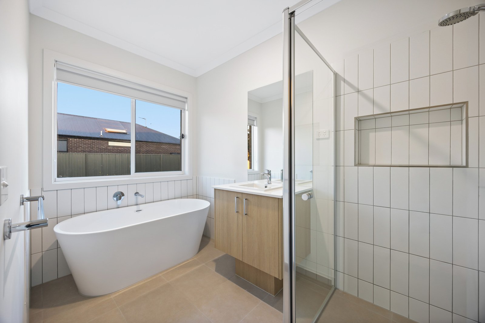 - Main bathroom with separate shower, bath and vanity