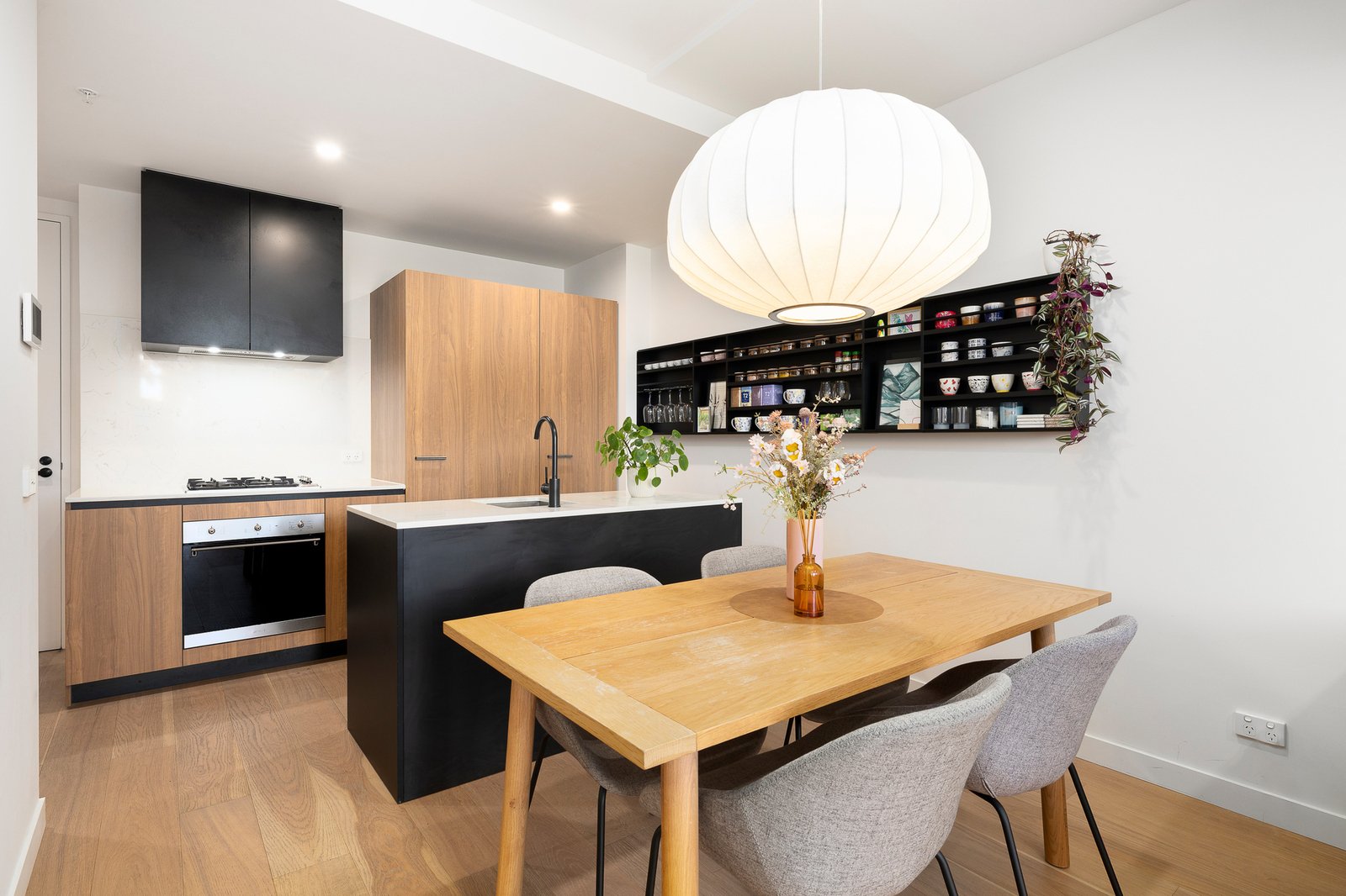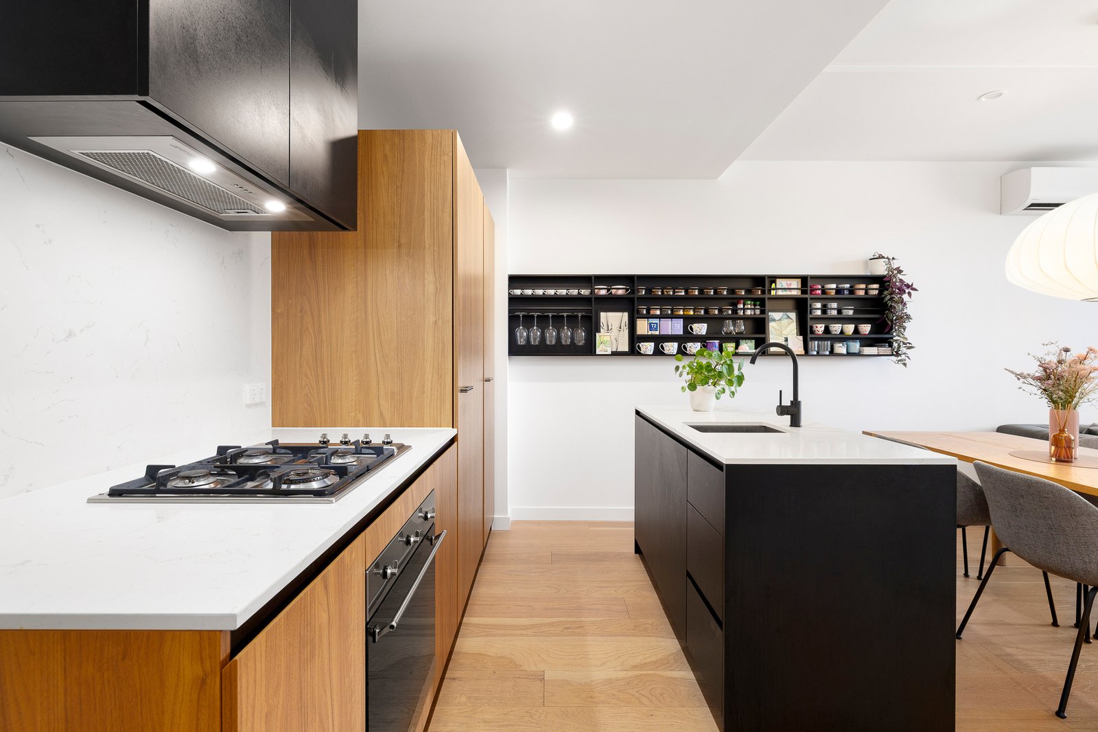 The contemporary kitchen is beautifully appointed with stone benchtops, premium Smeg appliances, and generous storage, balancing refined style with everyday functionality. A stunning ambient pendant light is included, adding warmth and character to the living space.