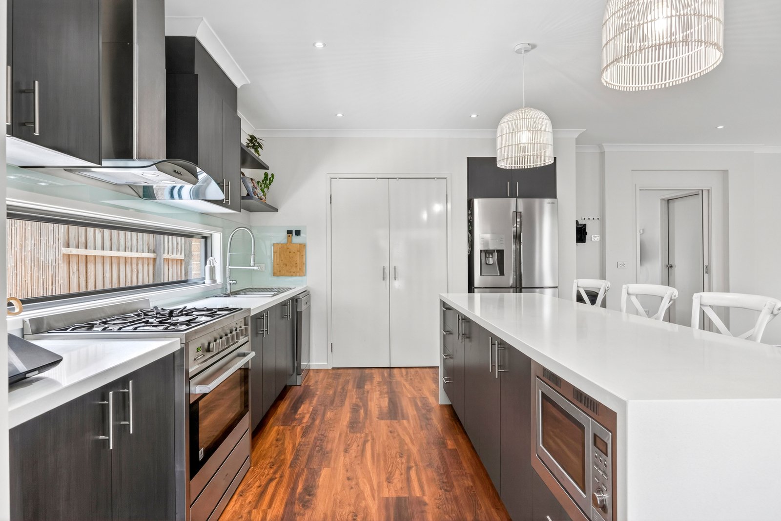 The impressive two-storey façade is classic in design and timeless in style. Double door entry leads into a wide entry hall, showcasing elegant interiors and generous scale within. A formal lounge off the entry is fitted with custom joinery and shelving, offering a versatile room suitable as living space or a large home office. The rear of the ground floor opens up to a spacious open plan kitchen, dining and living area, with beautiful bi-fold doors opening up from the living and dining areas to create a seamless indoor-outdoor connection. The quality kitchen features an island bench, waterfall stone benchtops, stainless steel appliances including a 900mm oven and cooktop, dishwasher, in-built microwave, and classic pendant lighting. Perfectly positioned to access the dining area and alfresco, the layout caters for effortless entertaining.