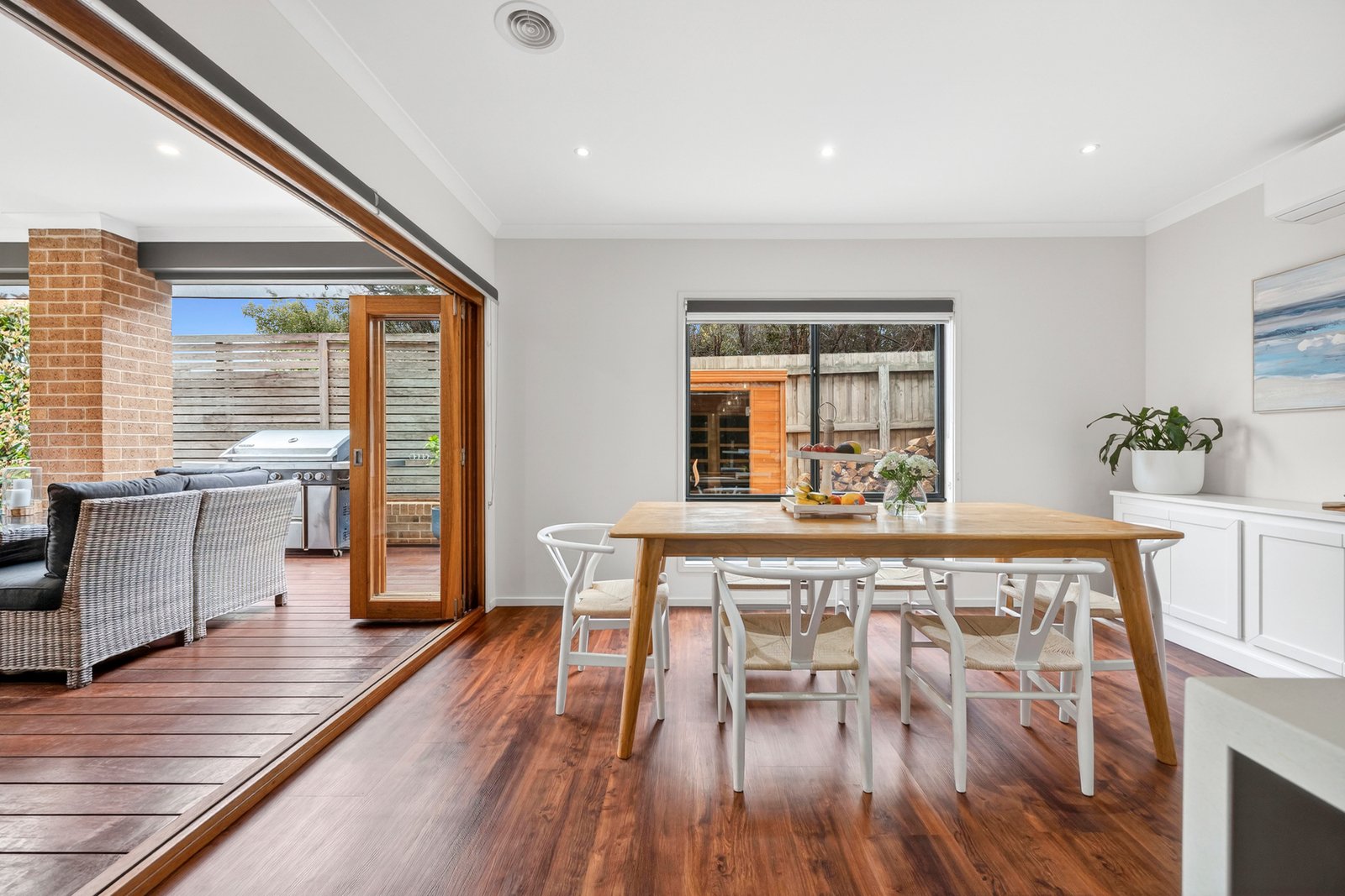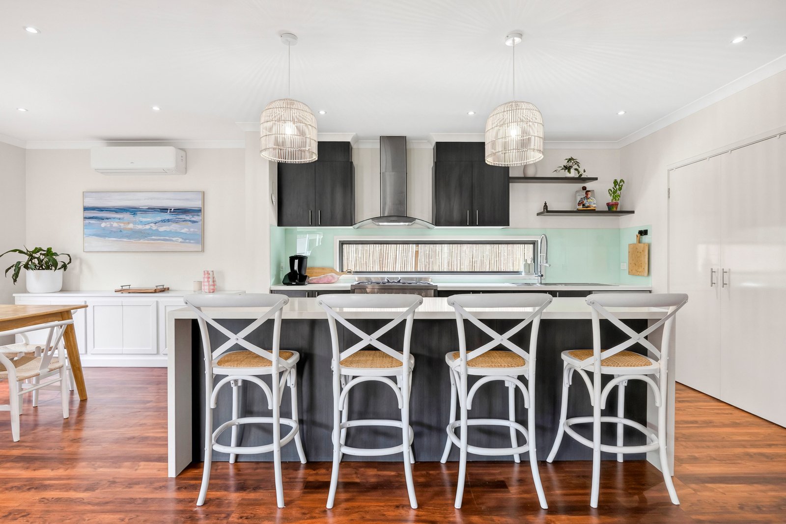 Designed for modern comfort, additional features include ducted heating, evaporative cooling, split system heating and cooling, ceiling fans, motorised external shutters and solar panels for energy efficiency, security system, ground floor powder room, well-appointed laundry with storage, upstairs linen storage, and understairs storeroom.