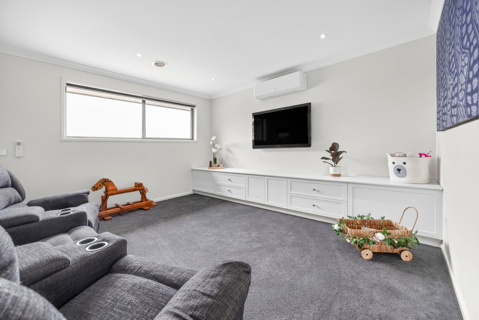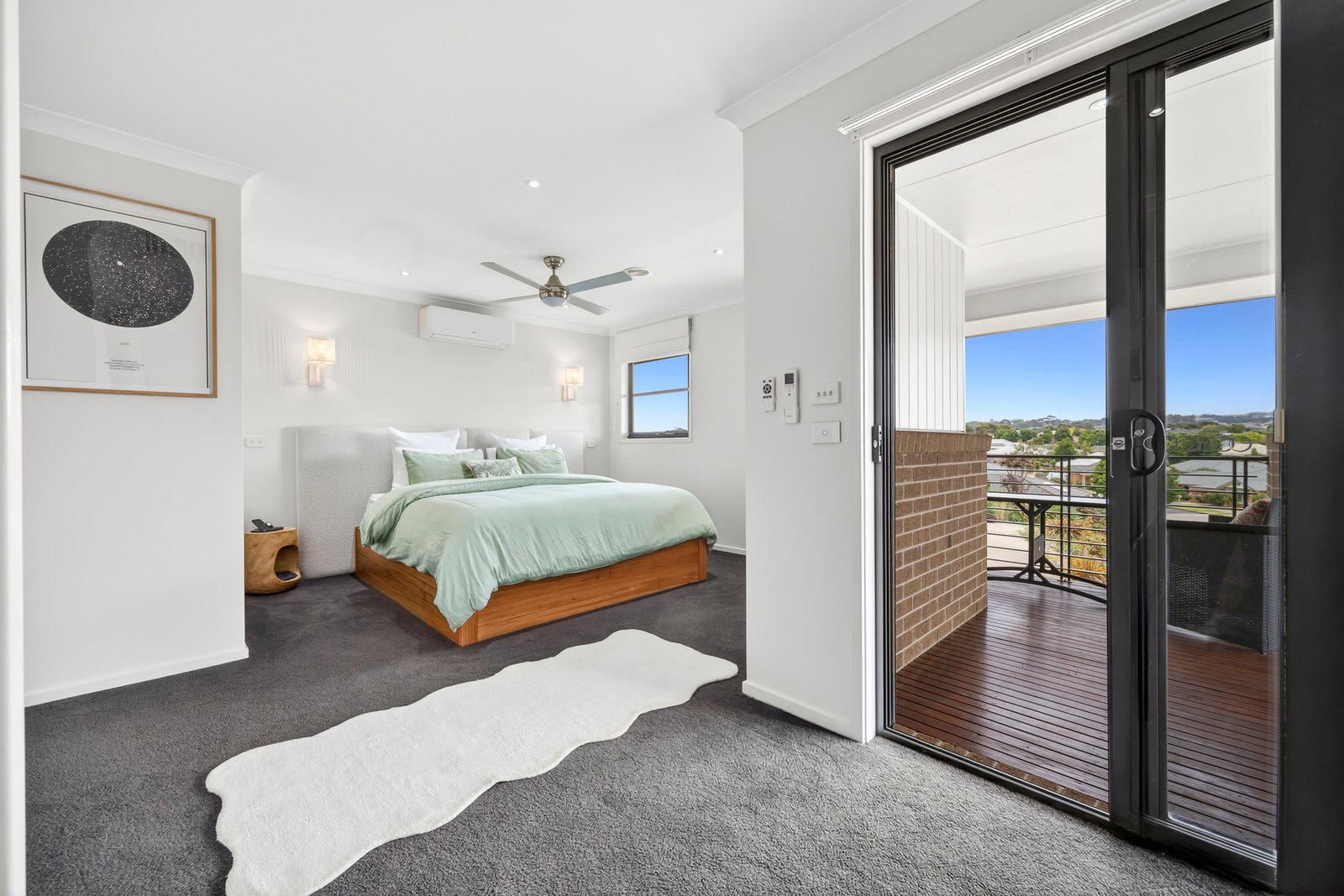 Upstairs, the luxurious main bedroom features ambient sconce lighting, walk-in robes, a tastefully presented ensuite with stone-topped vanity, and direct access to a private balcony with stunning views across Highton to the city skyline. Three further bedrooms all include built-in robes, serviced by a stylish family bathroom and a separate wc. A third living area on this level offers a quiet space to retreat or send the kids to play, with built-in cabinetry and storage adding both style and functionality.