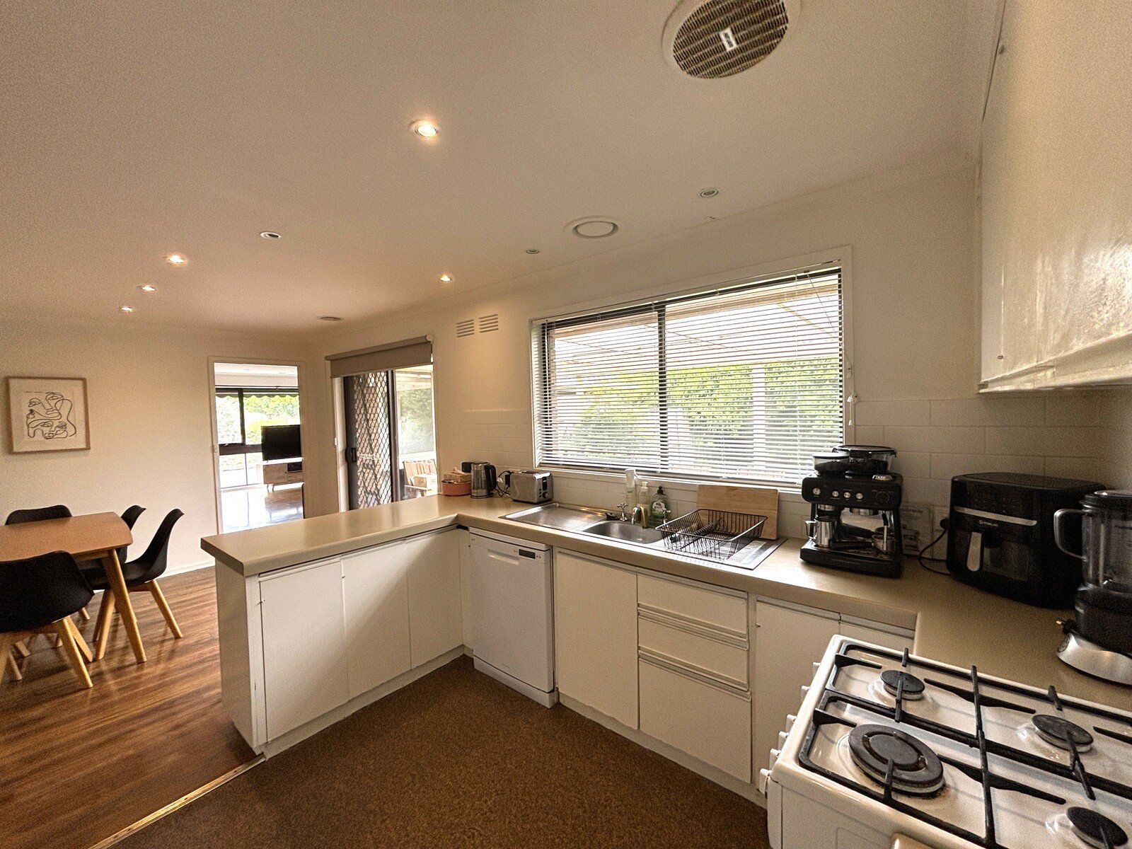 Inside, the home offers a light-filled and spacious living area, perfectly complemented by a functional kitchen and adjoining meals space featuring gas cooking and a dishwasher.