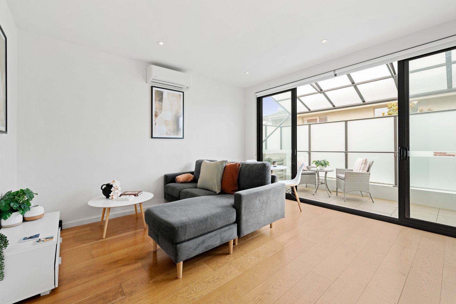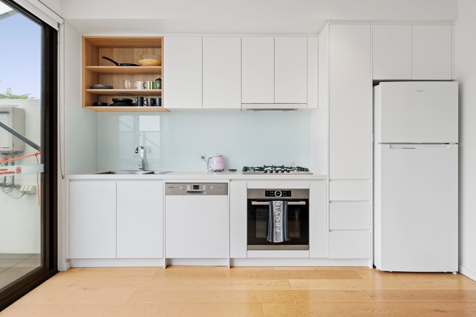 Engineered oak flooring flows through the light-filled open-plan living and dining domain, enhanced by plantation shutters and floor-to-ceiling sliding doors that open to a full-width undercover balcony, creating seamless indoor-outdoor living and entertaining. The gourmet stone kitchen with stainless steel Bosch appliances including dishwasher, and an abundance of soft-close cabinetry.