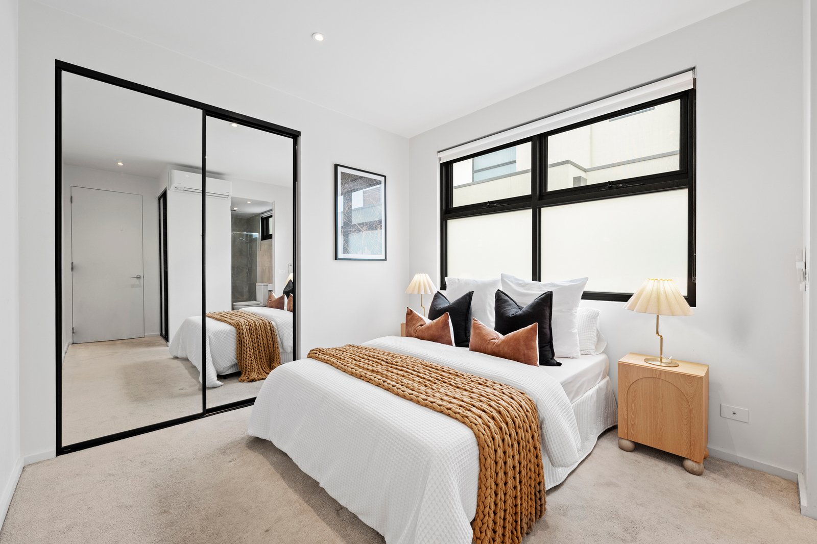 Featuring a generous main bedroom with mirrored built-in robes and a luxe fully tiled ensuite, alongside a second bedroom also with mirrored robes. A stunning central bathroom, European laundry and thoughtful inclusions such as split-system heating and cooling, and video intercom entry enhance everyday comfort and functionality.