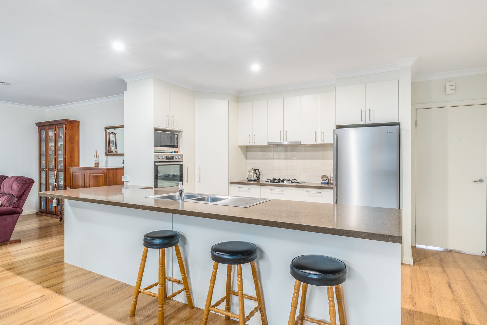 The contemporary kitchen is both stylish and functional, featuring quality appliances, generous cupboard and bench space, and an intuitive layout that allows the home cook to stay connected with family and guests. Whether preparing casual meals or hosting friends, this space has been designed for ease and enjoyment.