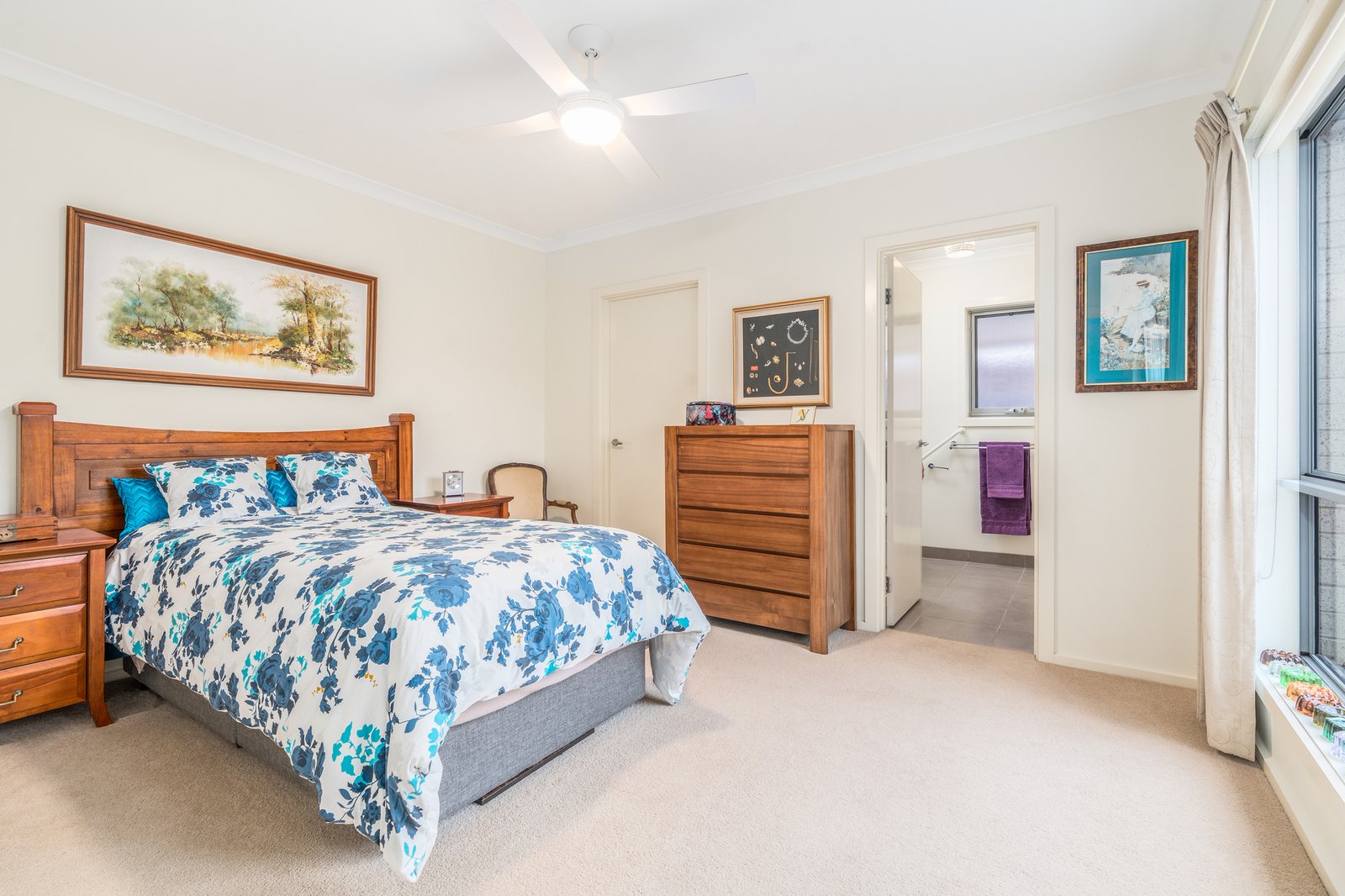 Accommodation is thoughtfully zoned to provide privacy and comfort for all occupants. The light-filled master bedroom is well proportioned and includes a built-in robe and a private ensuite, creating a peaceful retreat. Two additional bedrooms, also fitted with built-in robes, are serviced by a centrally located main bathroom featuring quality fixtures and excellent storage. This versatile layout makes the home equally suitable for professionals or those looking to downsize without compromise.