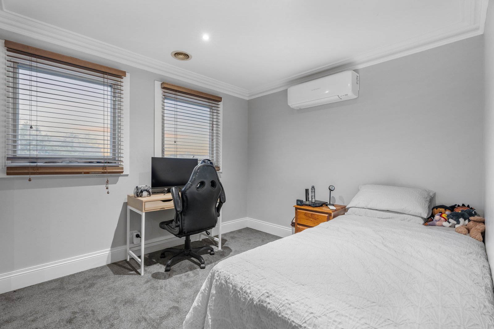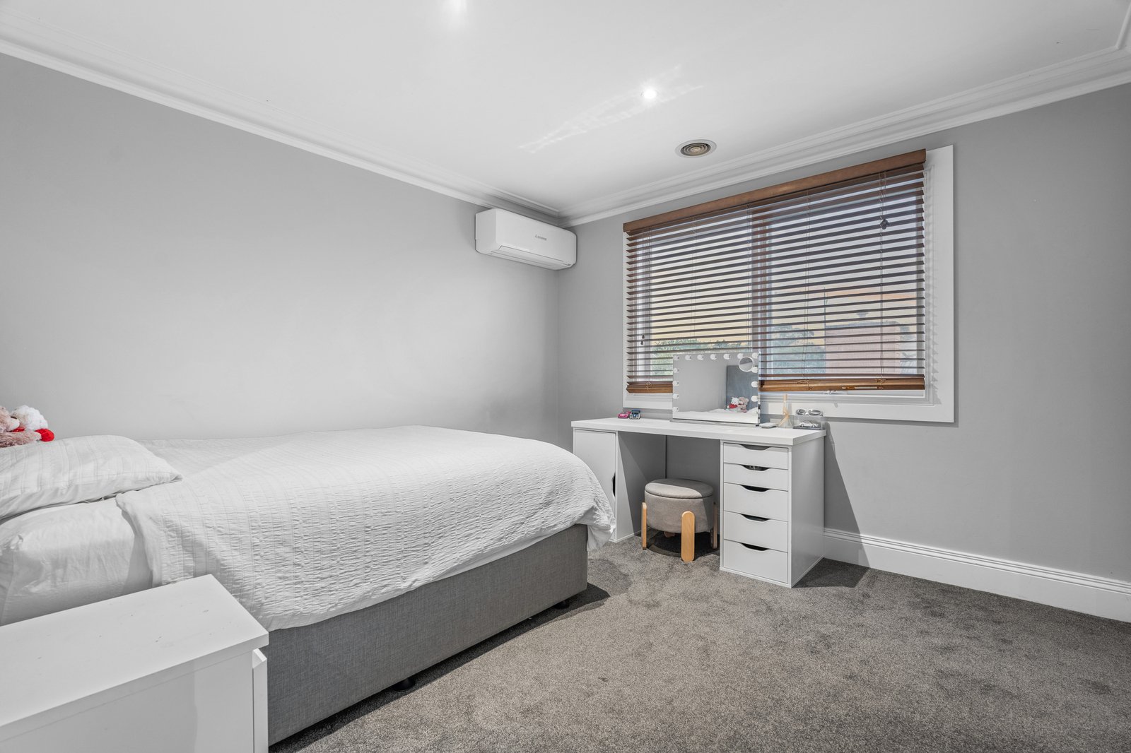 Optioned up with mirrored and walk-in robes, this family-wise design goes above and beyond with an adaptable storeroom for the home-office, a step-in pantry, and an under-stair area providing a ‘secret’ cellar space. Styled with warm polished boards, cool stone benchtops and family-friendly charcoal carpets, this centrally-heated home has individual climate-control with a reverse-cycle air-conditioner for every room and generous car space with a double auto-garage with parking in front.