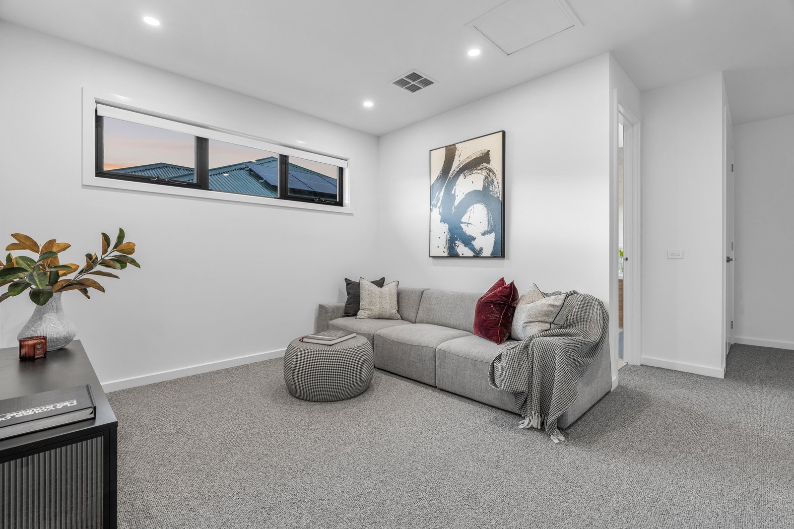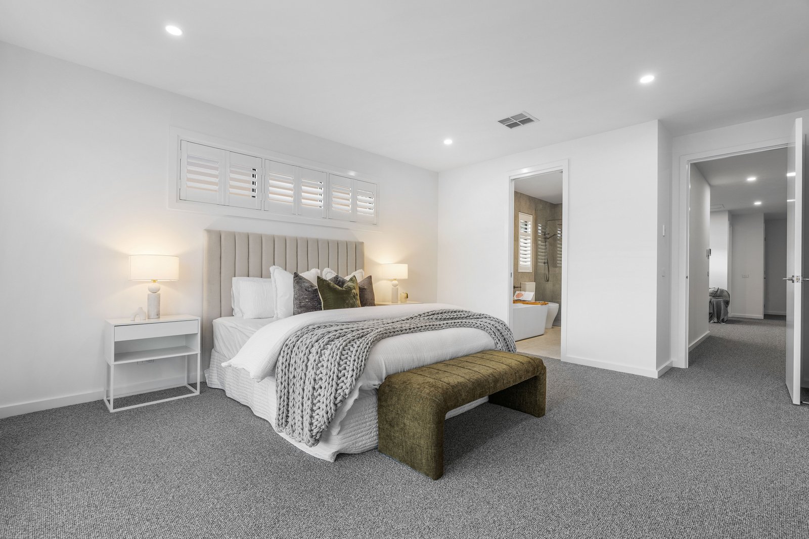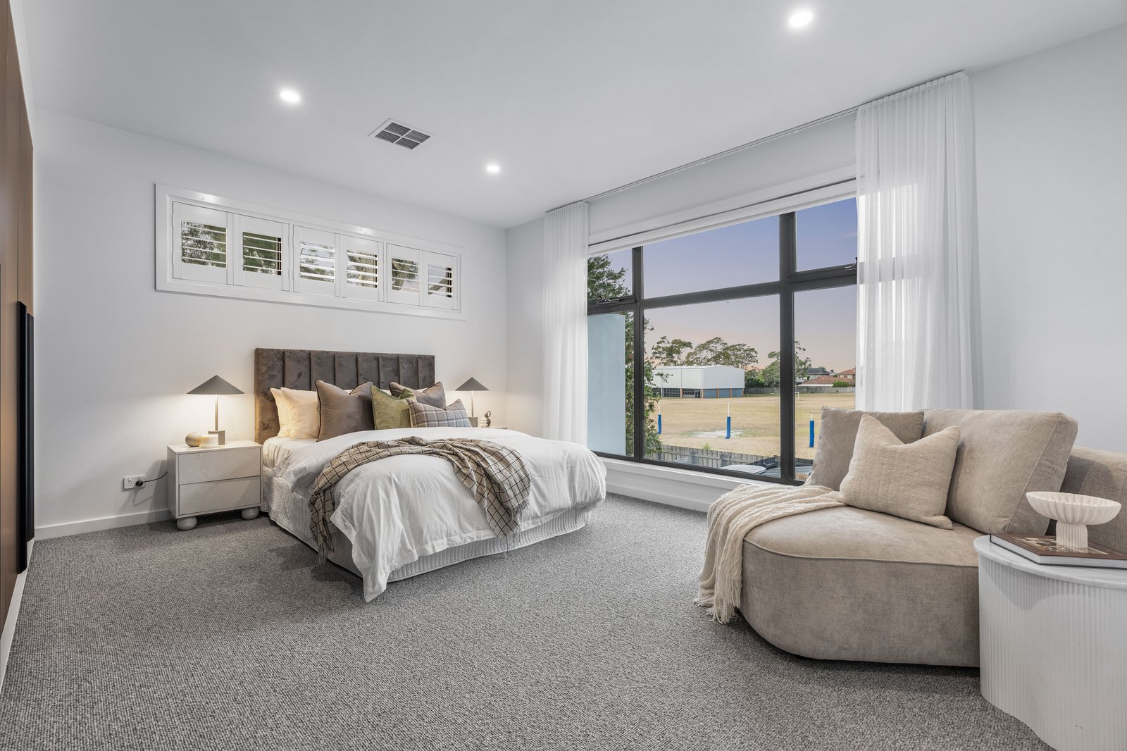 Climate controlled by a Smartphone-operated system across multiple zones, the home is secured by an alarm, Smartphone video-intercom (screens upstairs and down) and 4-camera CCTV. Energy efficient with 3-Phase power and double-glazing throughout, there’s also provision for a future solar energy-system and EV-charging. Even the outdoors are up-sized and optioned up with a professional landscape including fast-growing hedging for the genuine backyard, at least two car parking including a super-deep garage, and above-spec 6000L water-storage included for a healthy garden.
