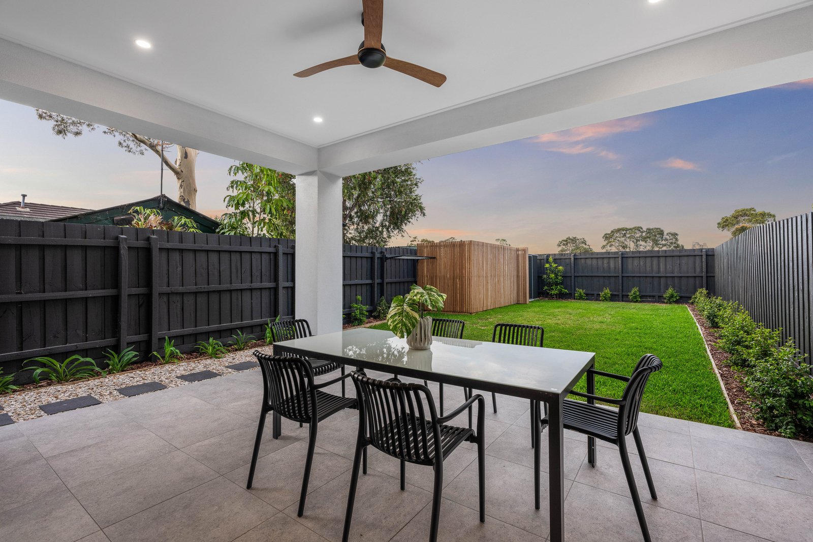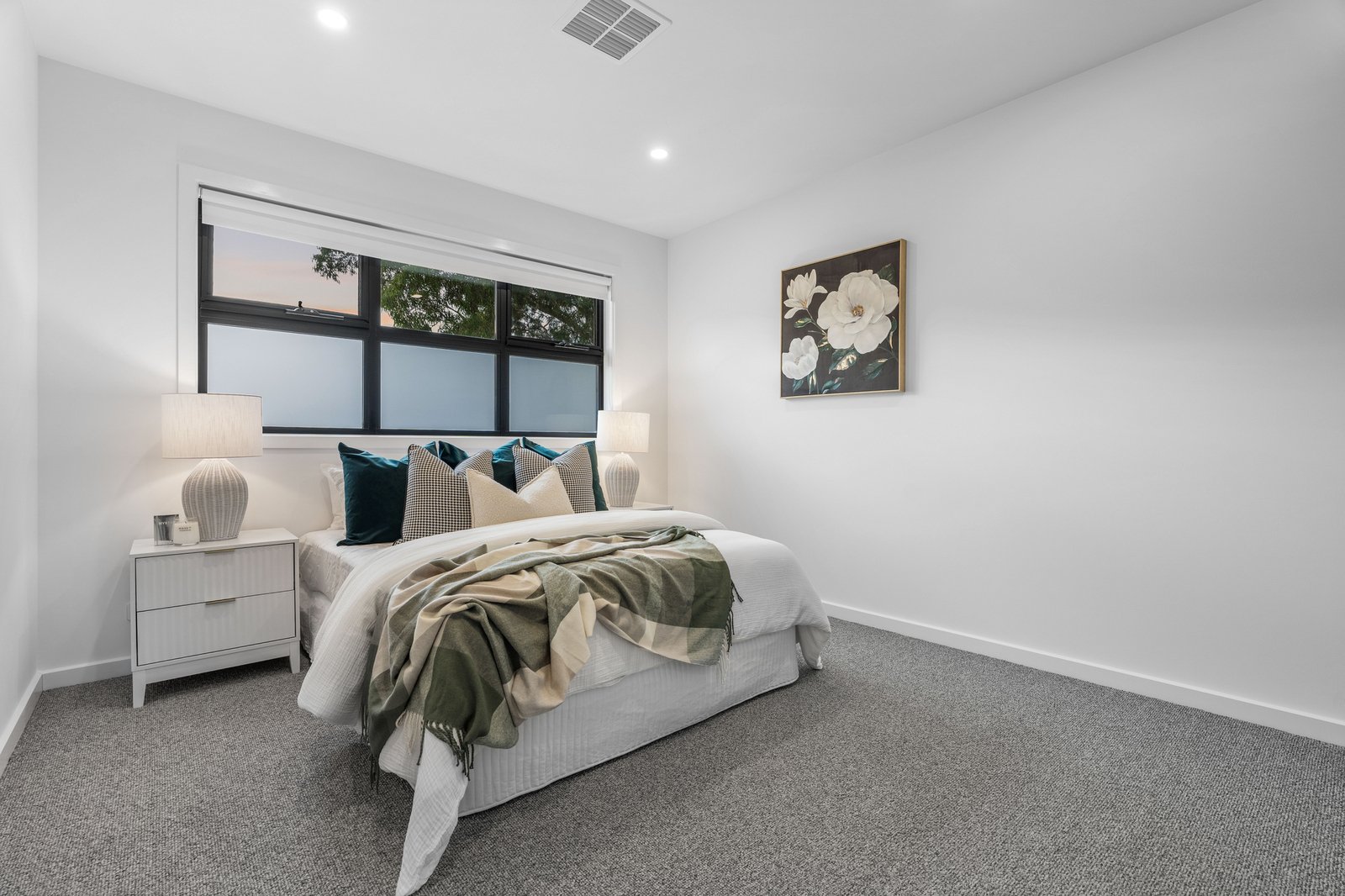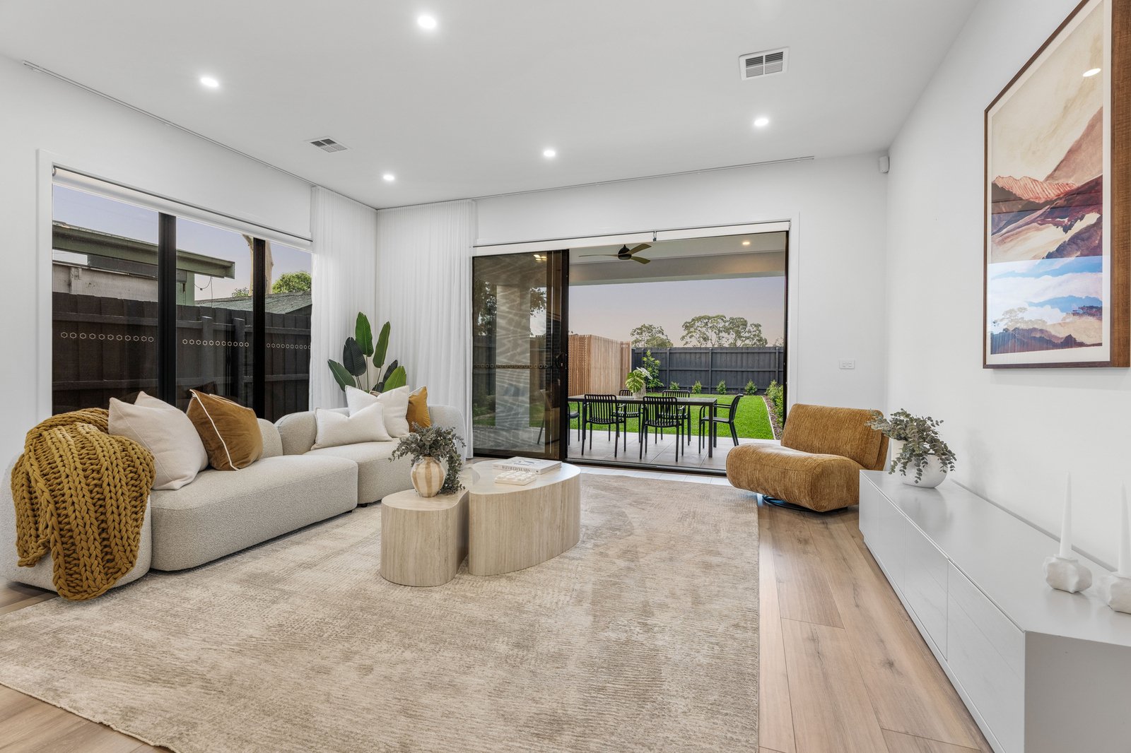 Climate controlled by a Smartphone-operated system across multiple zones, the home is secured by an alarm, Smartphone video-intercom (screens upstairs and down) and 4-camera CCTV. Energy efficient with 3-Phase power and double-glazing throughout, there’s also provision for a future solar energy-system and EV-charging. Even the outdoors are up-sized and optioned up with a professional landscape including fast-growing hedging for the genuine backyard, at least two car parking including a super-deep garage, and above-spec 6000L water-storage included for a healthy garden.