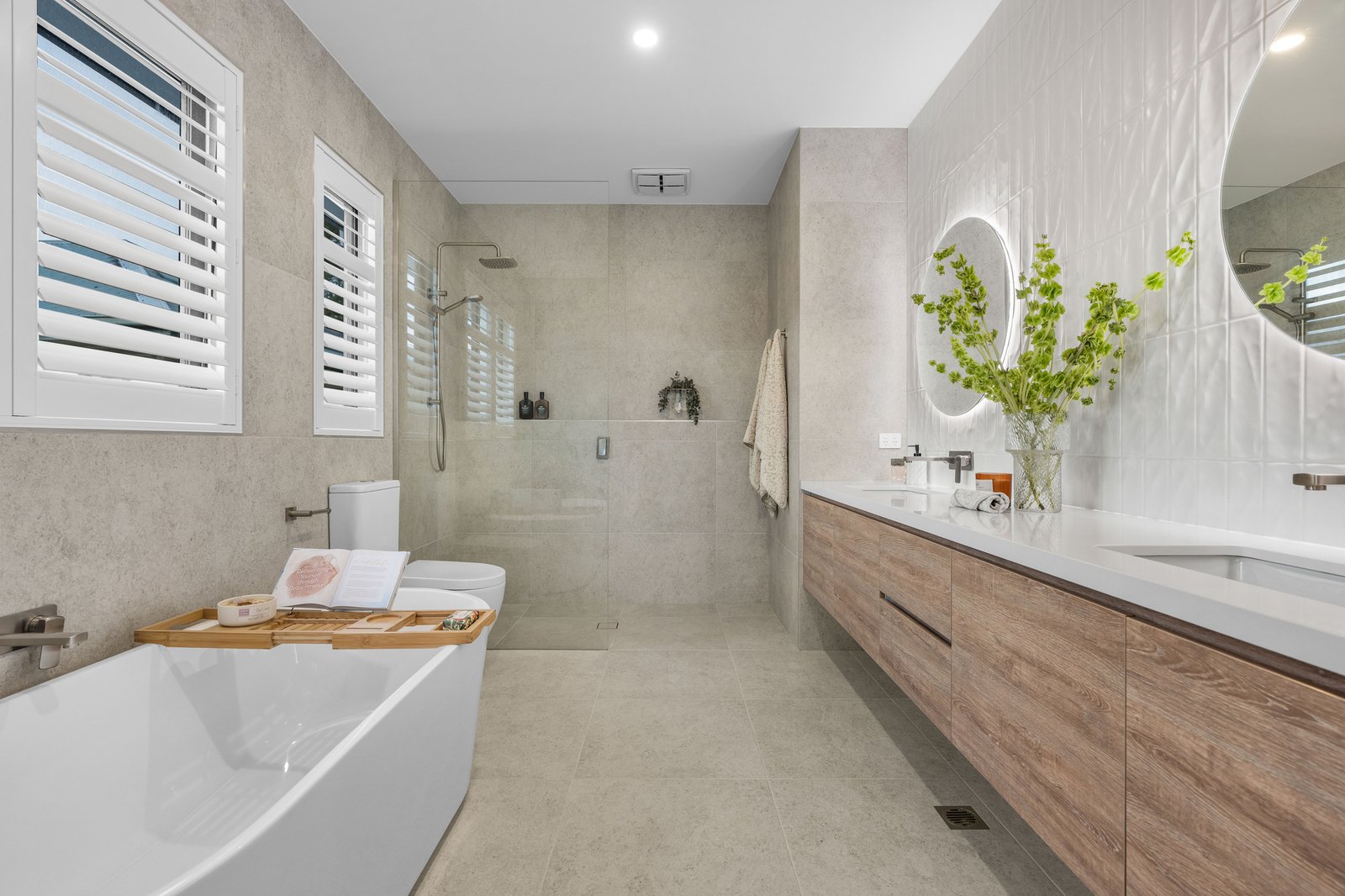 Going above and beyond this leading builder’s demanding specification, the home is upgraded with custom soft-close cabinetry including bonus overhead cupboards and a 3+ metre waterfall-edge peninsula-bench for the Miele kitchen, dual ovens and 900mm induction cooktop. Optioned up with floor-to-ceiling tiling and LED-lit mirrors for each bathroom area (even the oversize powder-room), there are high-end fittings including a freestanding bath for the principal dual-vanity ensuite, and fitted robes including walk-ins for each suite