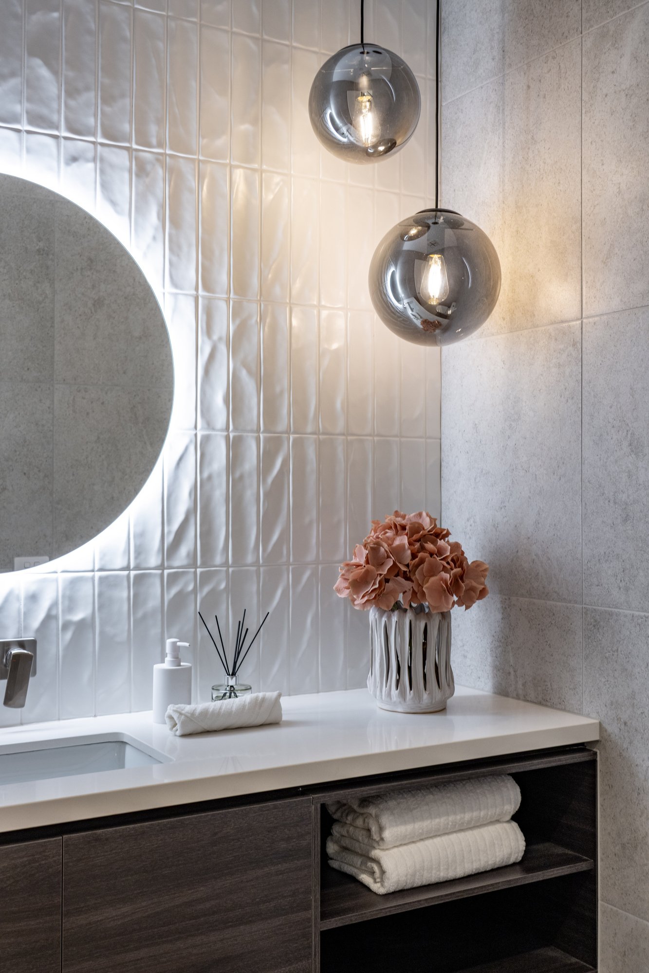 Styled with premium Caesarstone benchtops, prestige loop-pile carpet, wideboard floors and brushed-nickel tapware and hardware, this beyond-prestige home features luxe window furnishings including plantation-shutters, roof hung sheers and holland blinds, and designer lighting including a strip-pendant for the kitchen, sparkling spheres for some bathrooms and select under-cabinet strip-lighting.