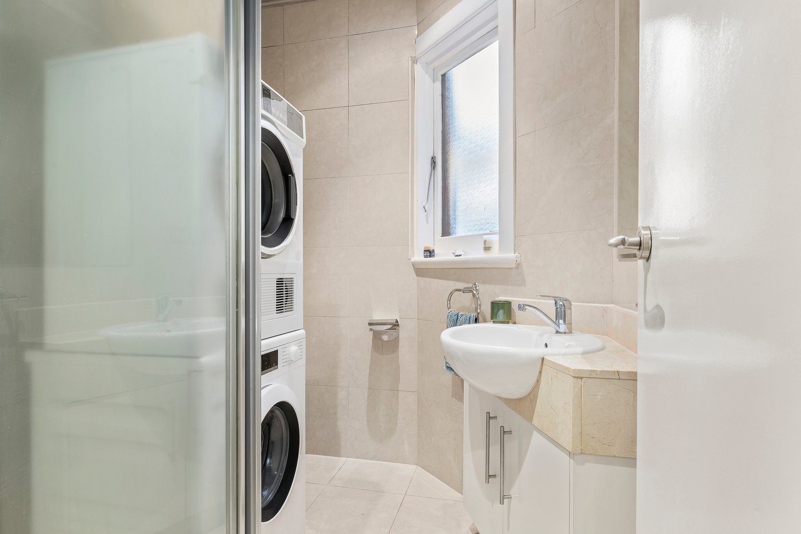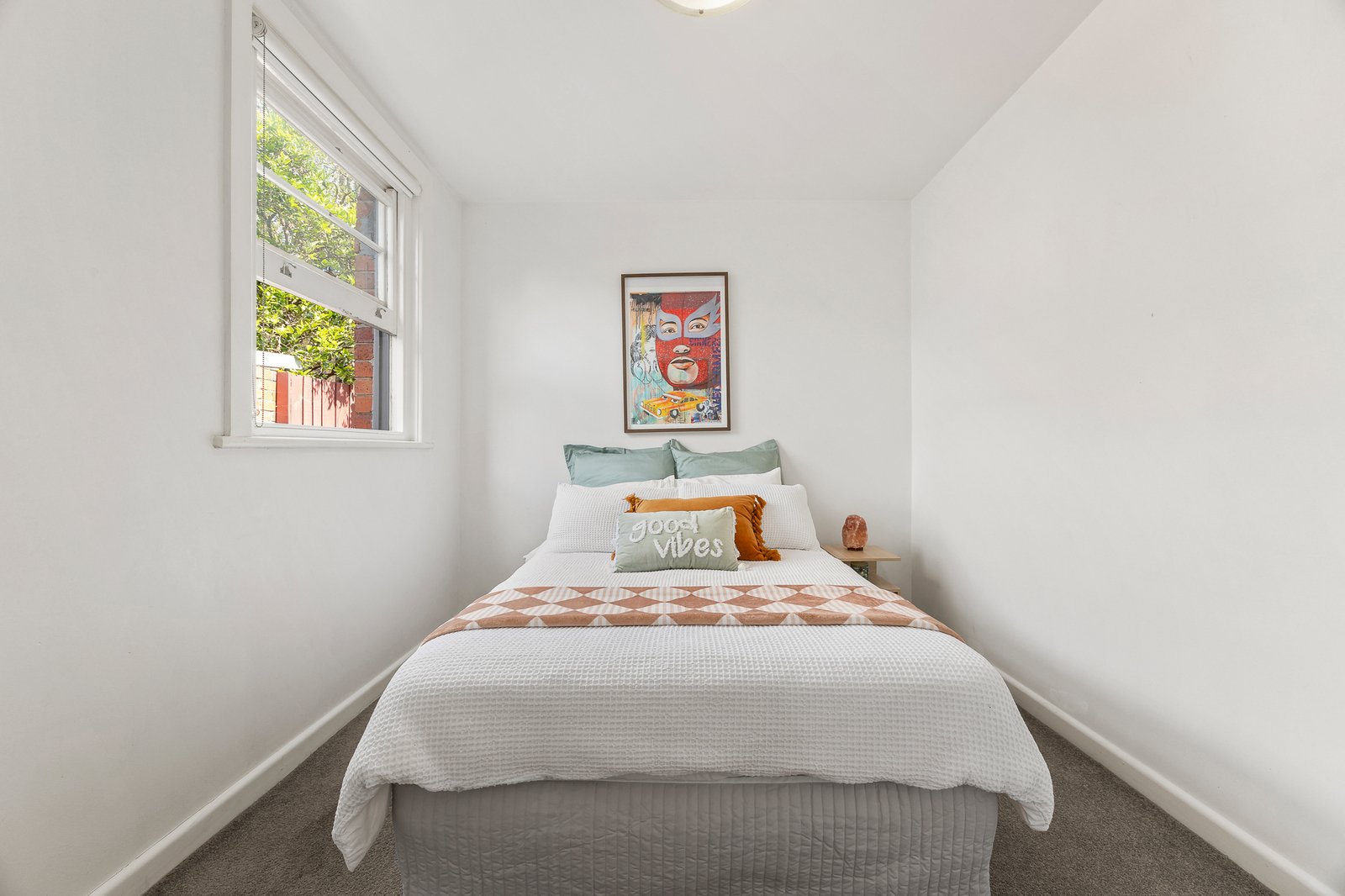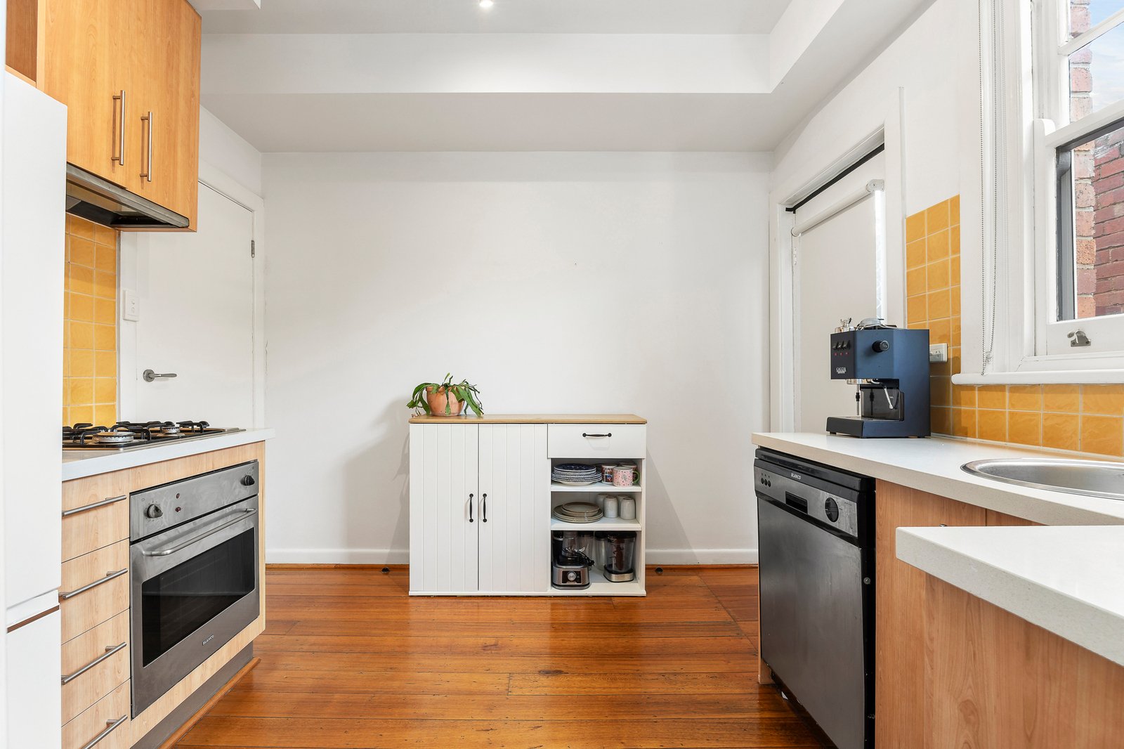 Both light-filled bedrooms are serviced by a fully tiled bathroom with a stone-topped vanity, walk-in shower and laundry capacity. Additional features include brand-new ducted heating, roller blinds with doubles in the front bedroom, track lighting, and key period detail including steel-framed casement windows, picture rails, and rich Tasmanian oak flooring.