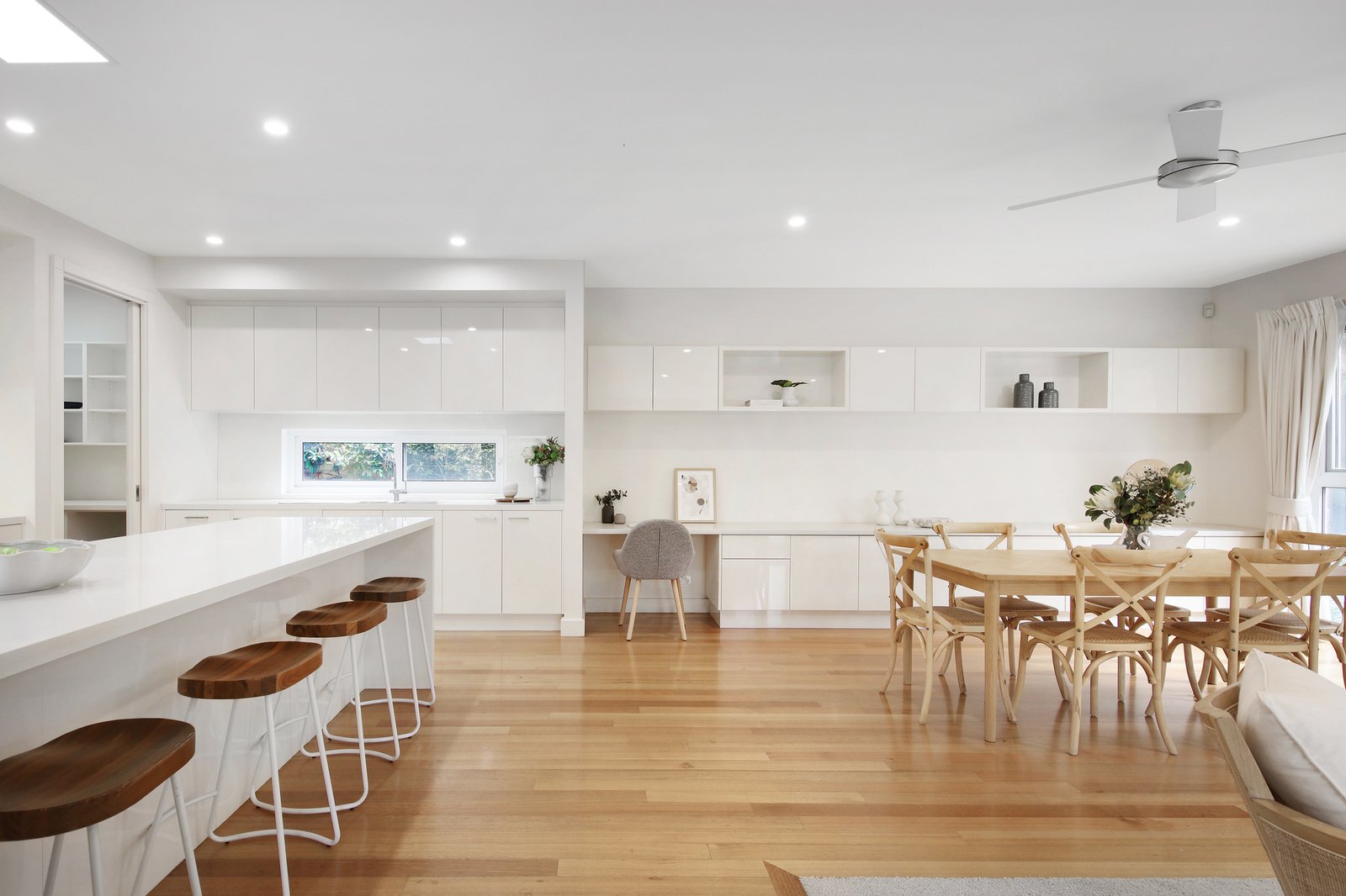 The upper level hosts queen-sized bedrooms giving children space to sleep, study, and retreat, along with a multi-workstation study area in the family zone for seamless work-life balance. The home encourages entertaining with a stone-wrapped island bench and butler's pantry servicing a super-sized Smeg and Bosch appliance kitchen, while plushly carpeted and polished floor spaces provide comfortable zones to lounge and dine.