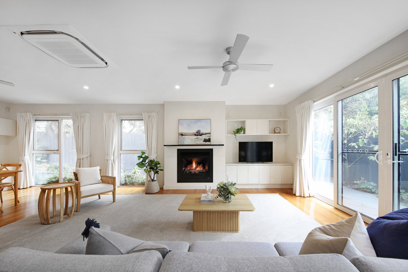 Every room features individual split-system heating and cooling, while the family room enjoys refrigerating heating and cooling, complemented by a cozy Heat & Glow fireplace, ensuring comfort in every season. The master suite is styled with an elegant dual-vanity ensuite with fan cooling, while the generous main bathroom and separate powder room maintain family harmony. Additional family extras include an alarm and intercom system, individual walk-in robes for every bedroom, double glazing throughout, and 22 solar panels for enhanced comfort, energy efficiency, and long-term savings. Car accommodation is equally impressive with secure auto-garaging for up to three vehicles under the roofline.
