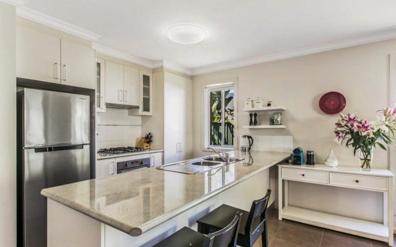 - Kitchen with gas cooking appliances, dishwasher, ample cupboard and bench space