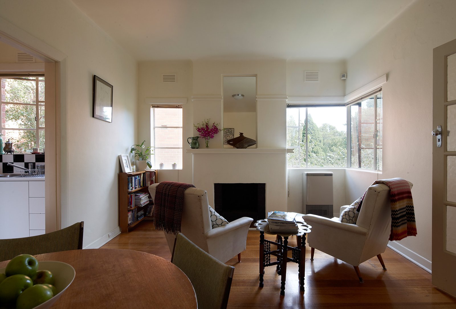 The apartment features a welcoming entrance hallway leading to a combined living and dining area complete with an ornate fireplace. The spacious kitchen is well appointed with gas cooking and laundry facilities. Both bedrooms are generously sized, with the main bedroom offering built-in robes.