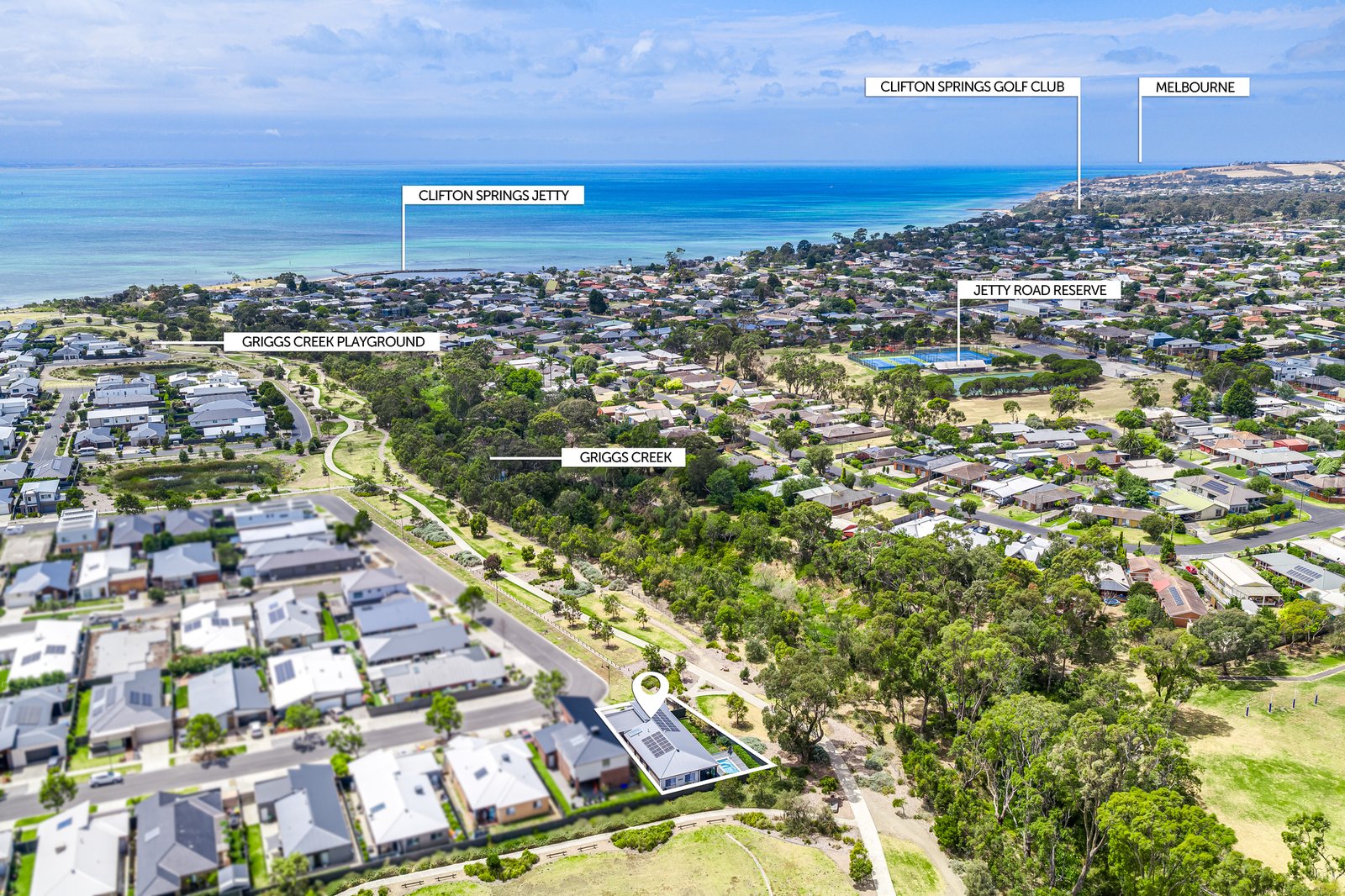 Luxury continues throughout the home with a beautifully appointed central family bathroom featuring a deep soaking bath and stone-top vanity, while an impressive suite of premium inclusions enhances everyday comfort, security and efficiency. Enjoy ducted refrigerated air conditioning, gas ducted heating, rain-head shower fittings, floor-to-ceiling curtains, remote-controlled ceiling fans and ambient downlighting throughout. NBN fibre connectivity and a six-camera CCTV security system provide modern convenience and peace of mind, while the double garage boasts high-gloss epoxy resin flooring with remote and internal access. A substantial 32-panel solar system further elevates the home’s appeal, delivering outstanding energy efficiency. Offering a refined coastal lifestyle moments from the bay and the best of the Bellarine, this exceptional residence represents luxury living at its finest.