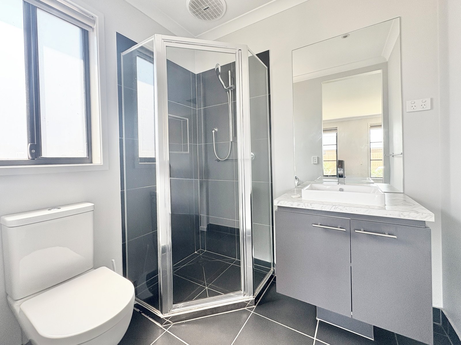 - Master bedroom featuring walk-in robe and ensuite with shower, vanity and toilet