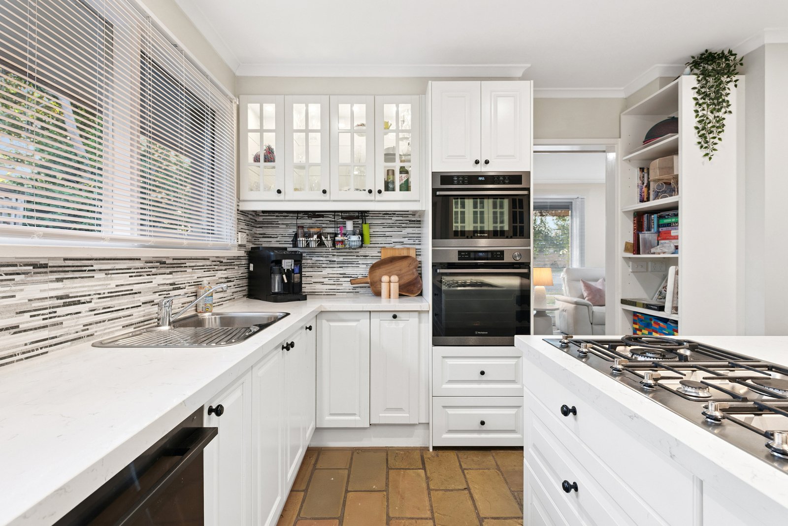 Filled with natural light and family appeal, the accommodation features a spacious formal lounge and dining room with a trio of windows looking out to the leafy front garden. The stylishly updated kitchen showcases luxe stone benchtops, premium appliances including dual ovens (one combi) and a Smeg cooktop – offering plenty of cupboard space and an island bench that will entice those who love to entertain.
