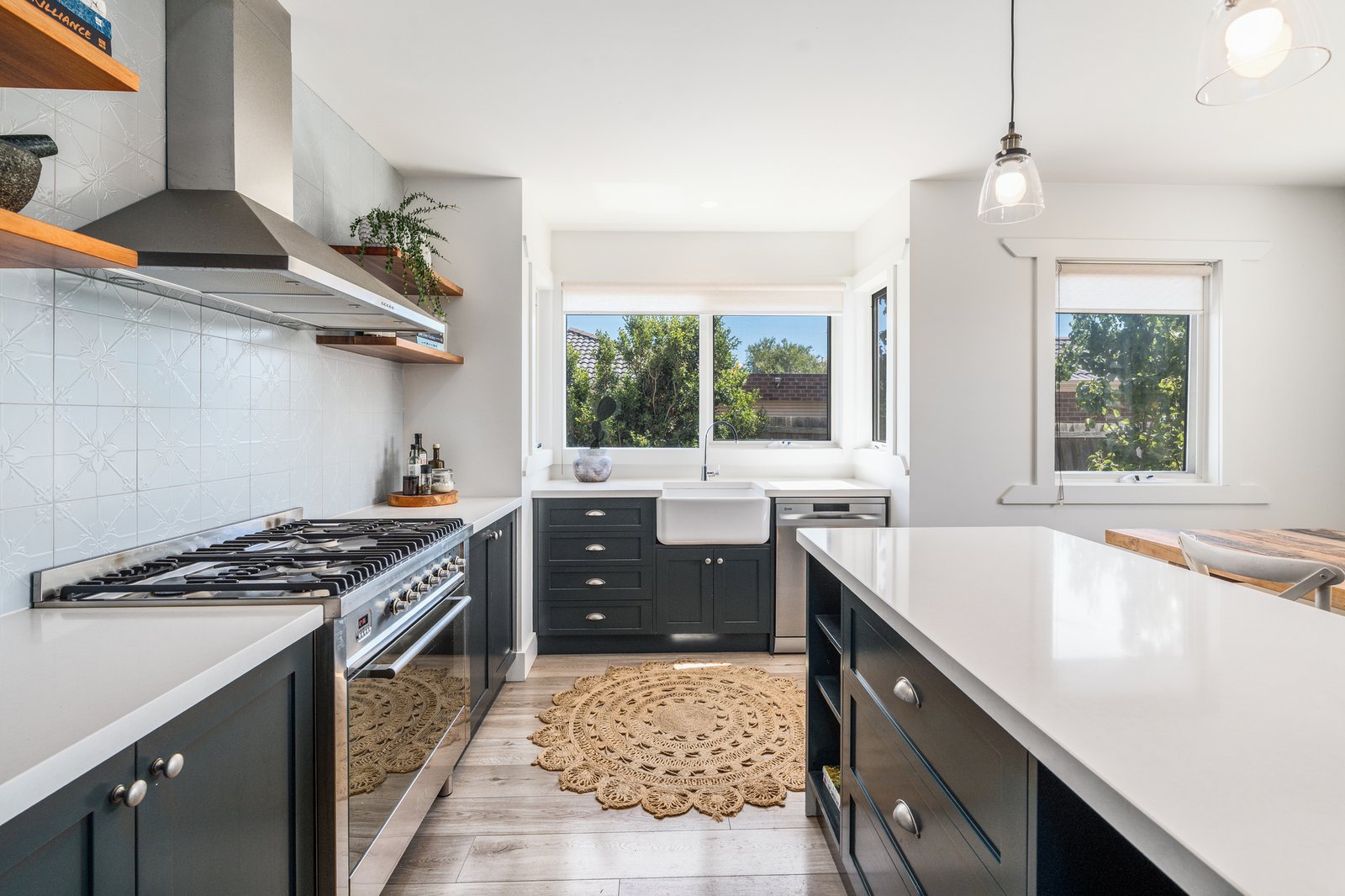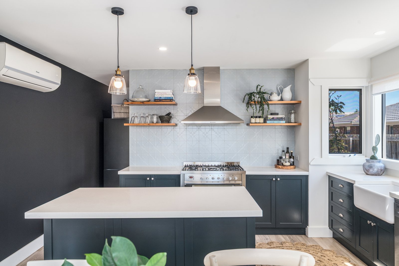 - Modern kitchen featuring gas cooktop, oven, dishwasher, pantry and split-system heating and cooling