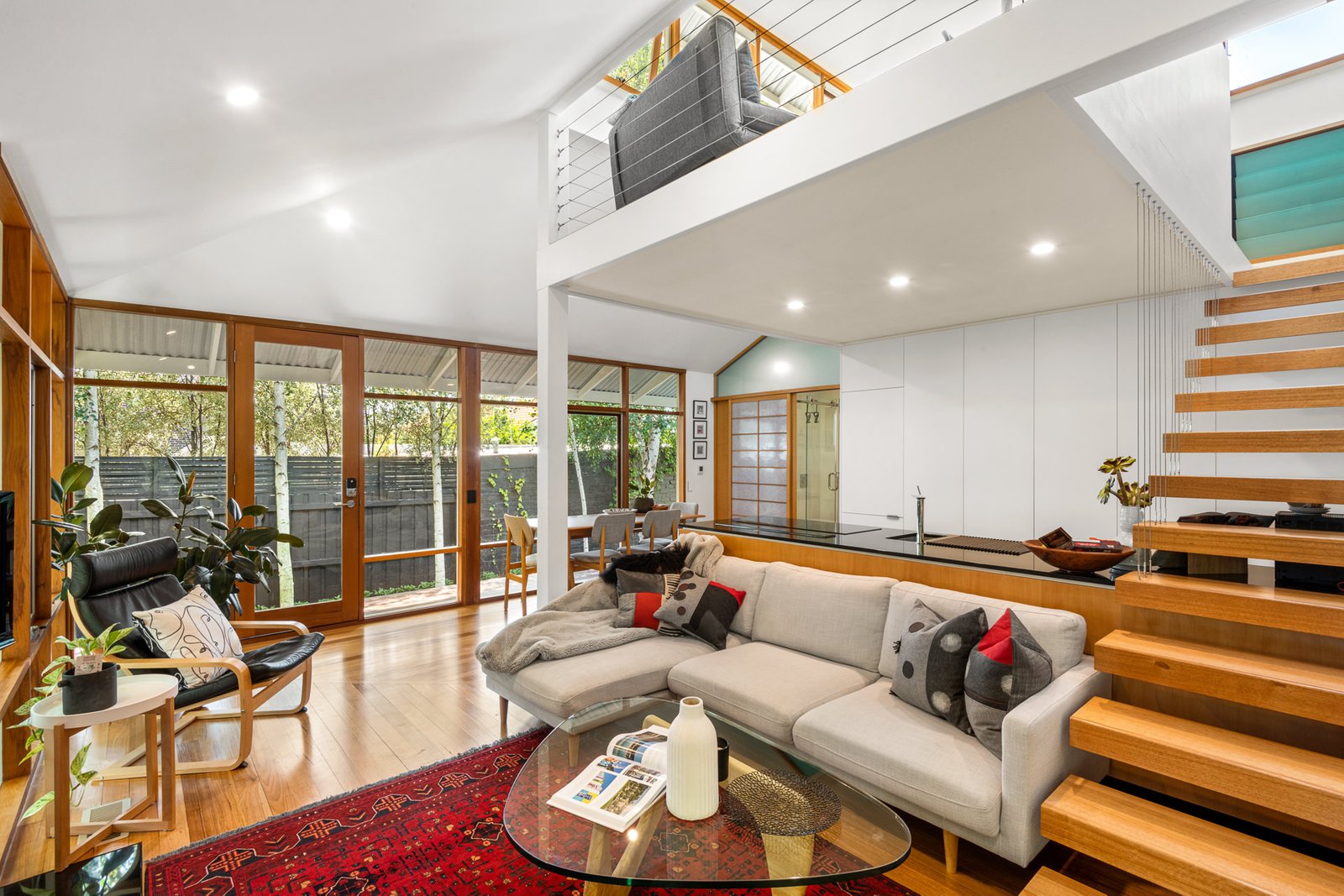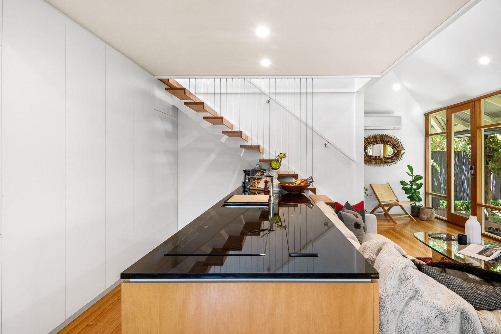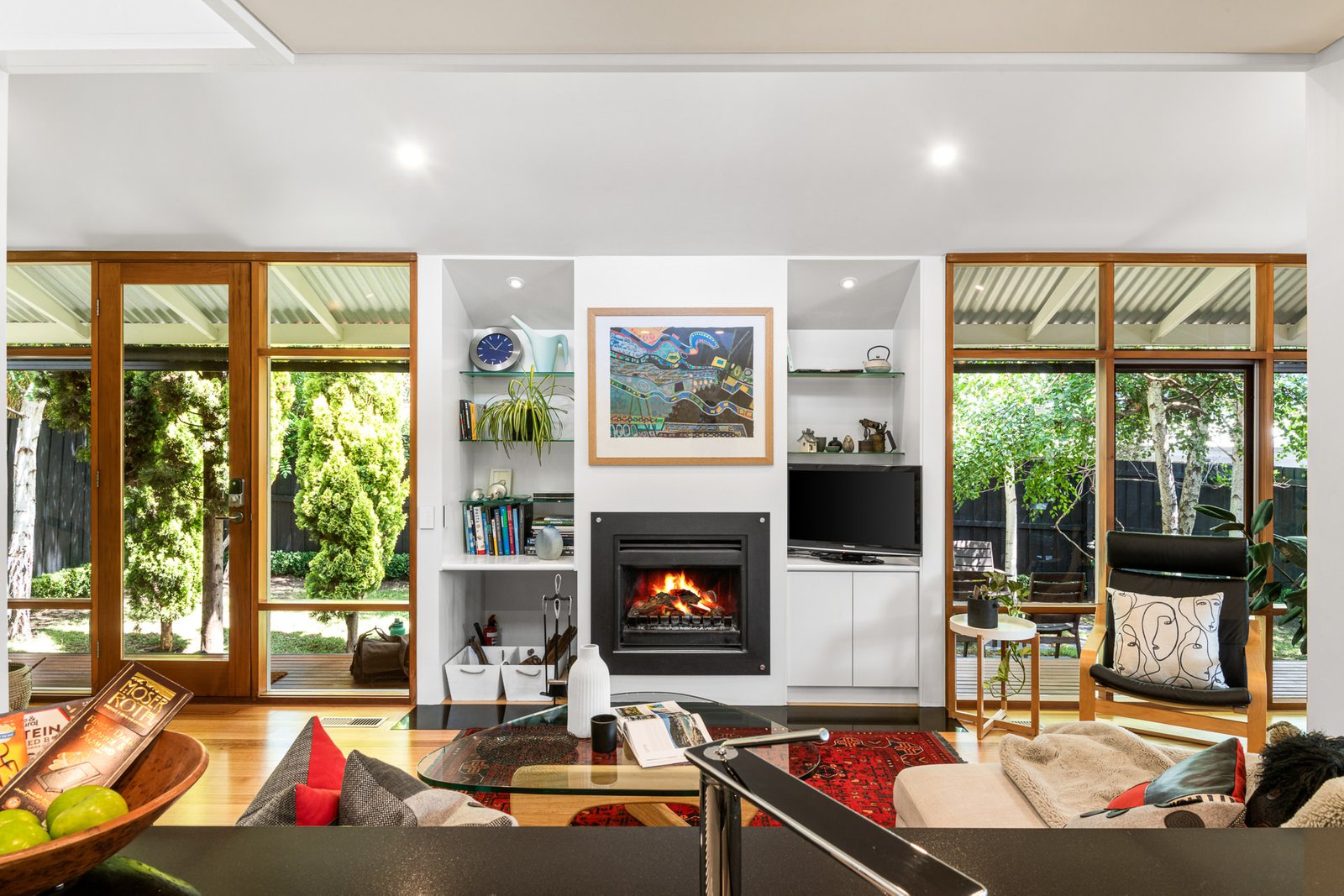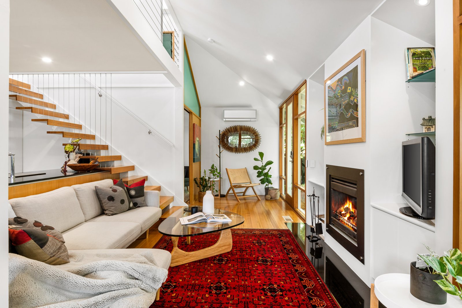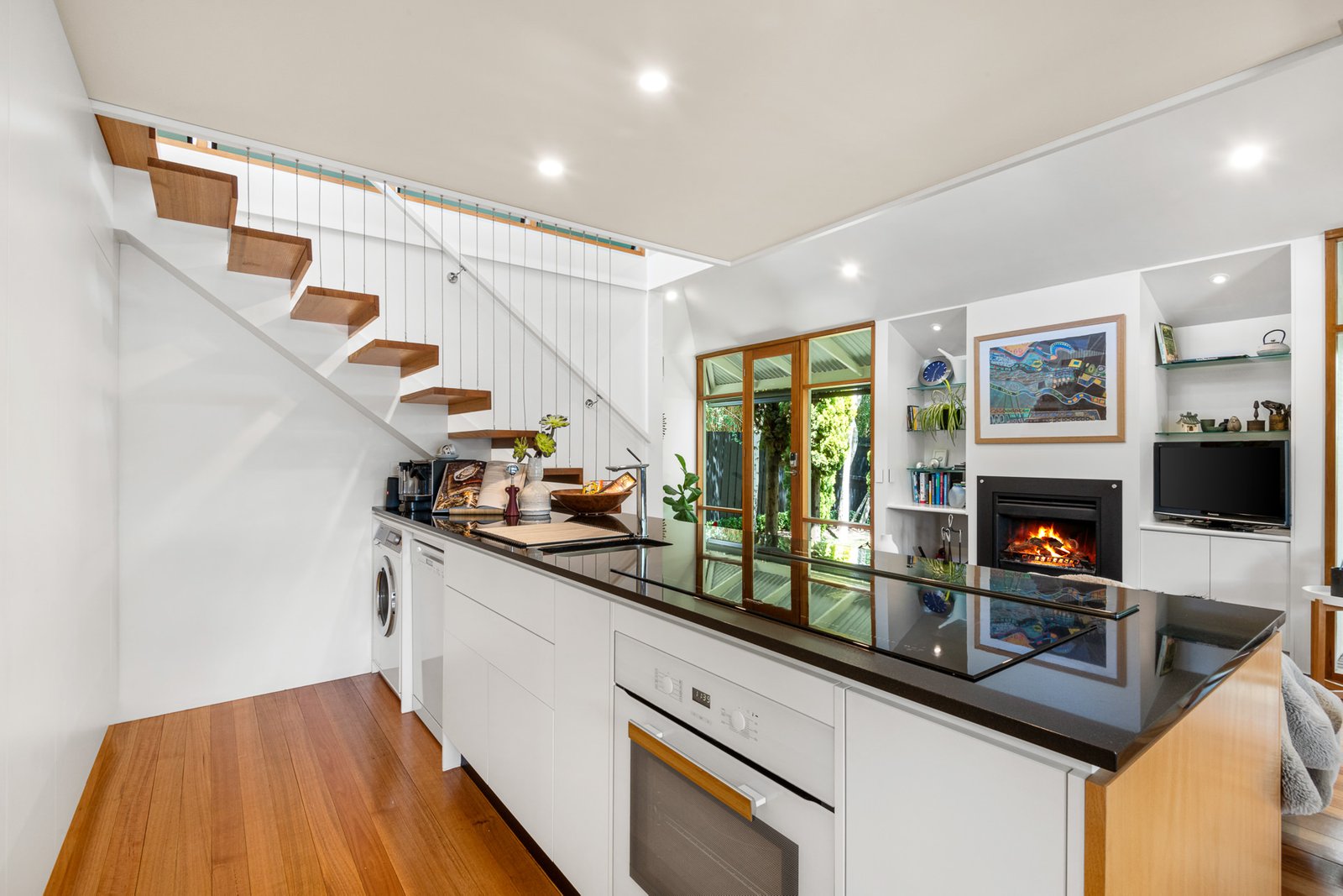 - An open-plan living, dining, and kitchen area with a wood fireplace, split system heating and cooling, and panoramic views of the garden beyond.