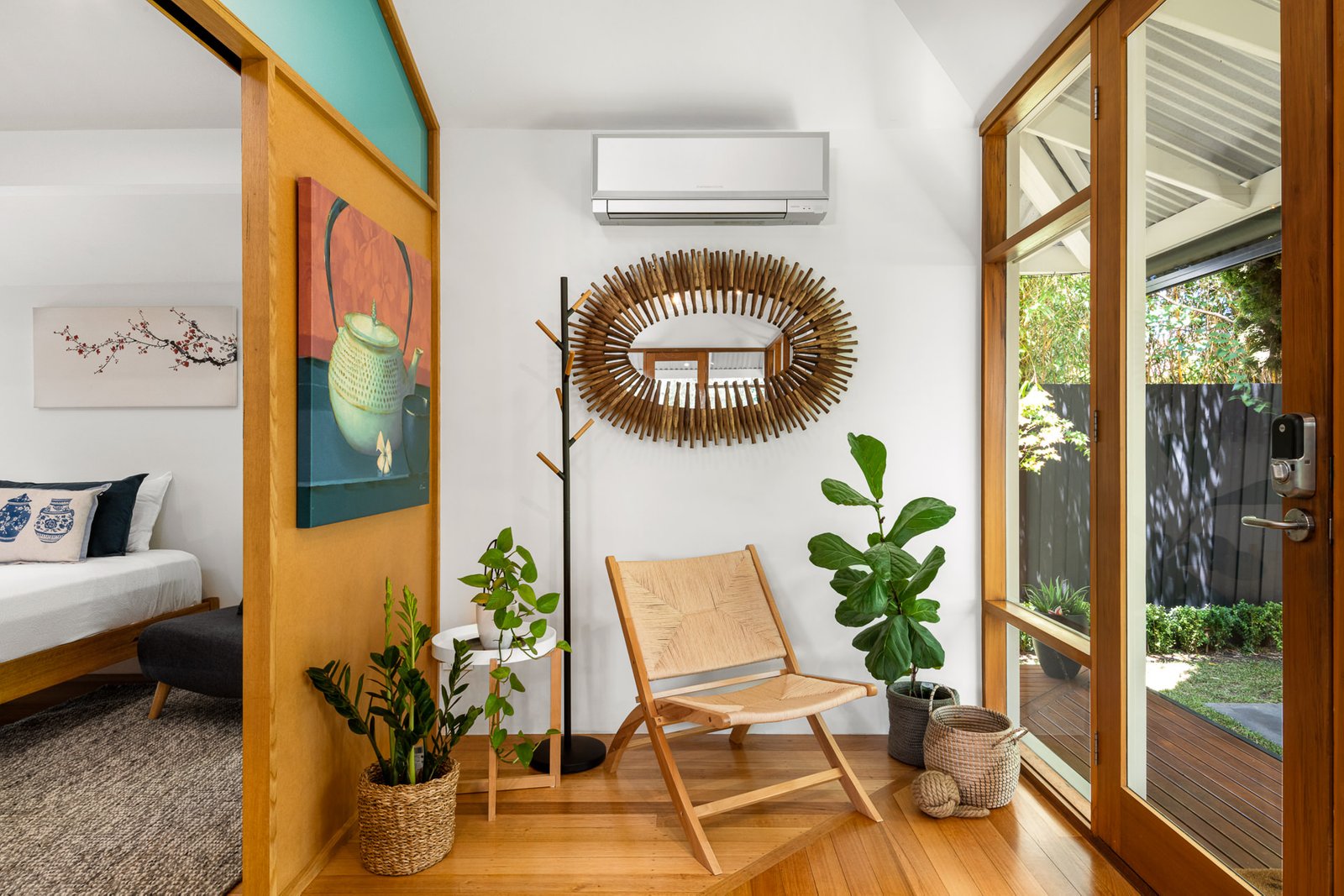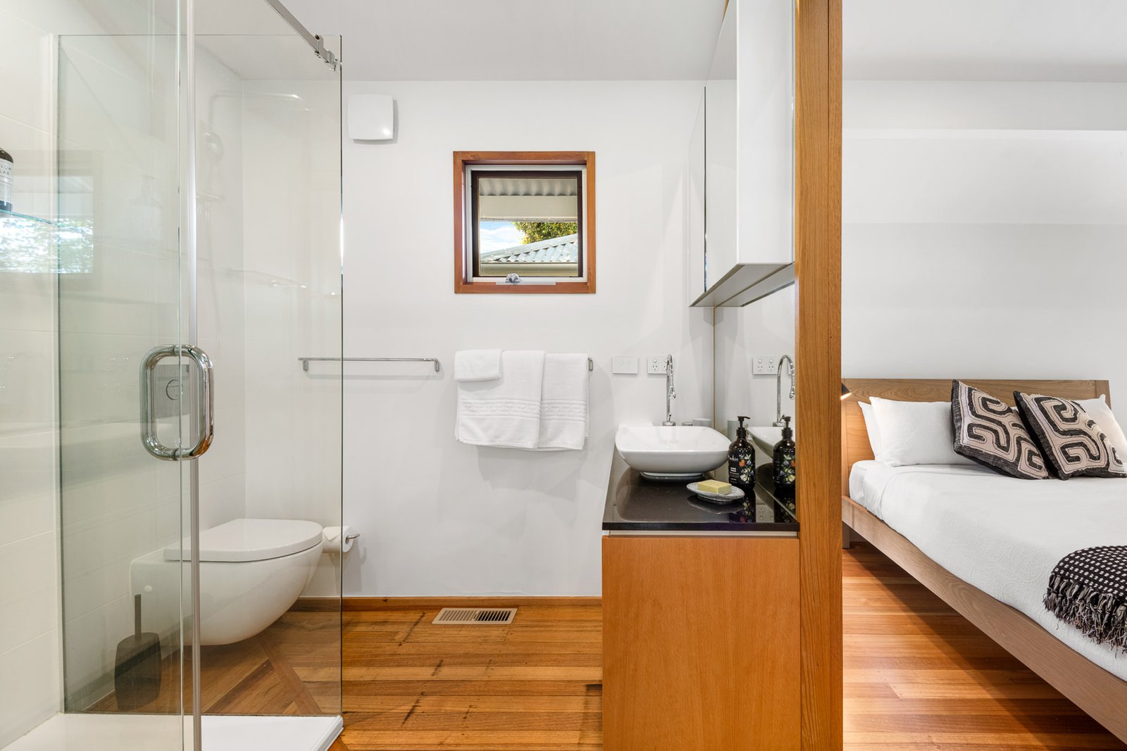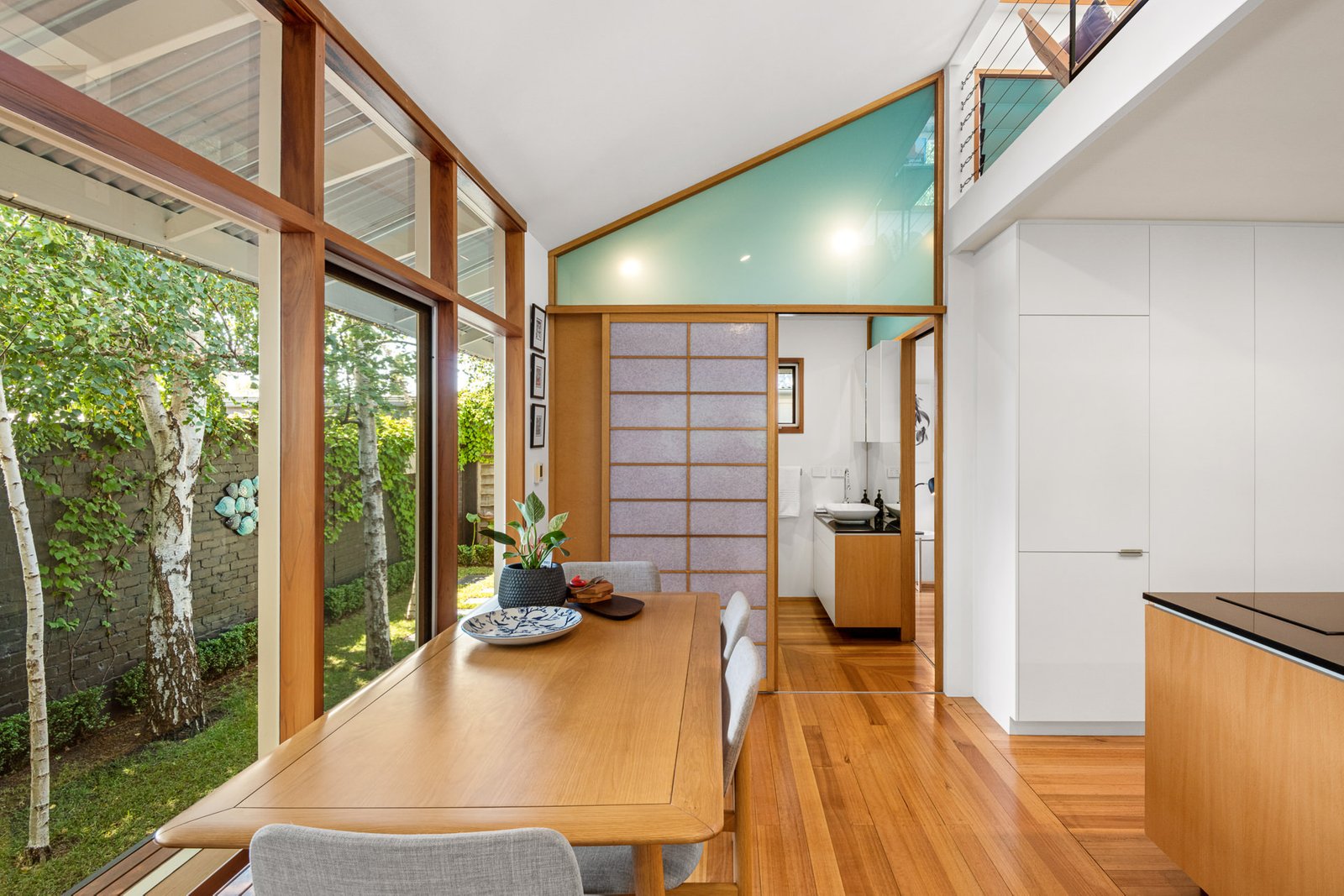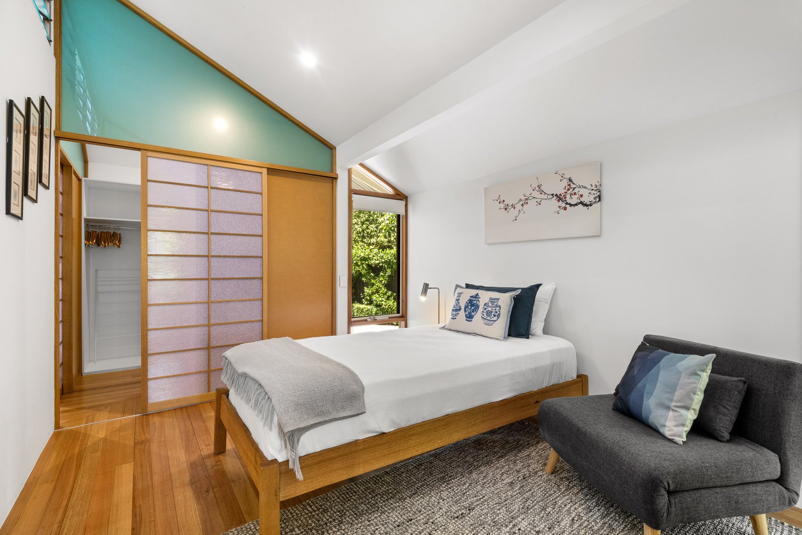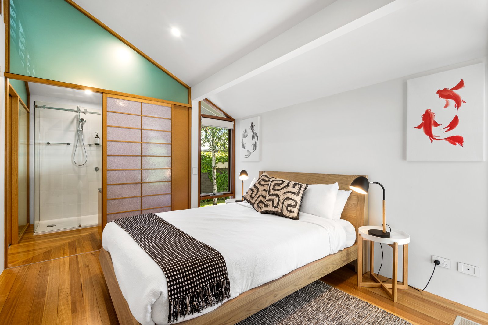 - Elegant Japanese Shoji screen doors, that are connected by a walk-through wardrobe, creating a tranquil and flexible living space.