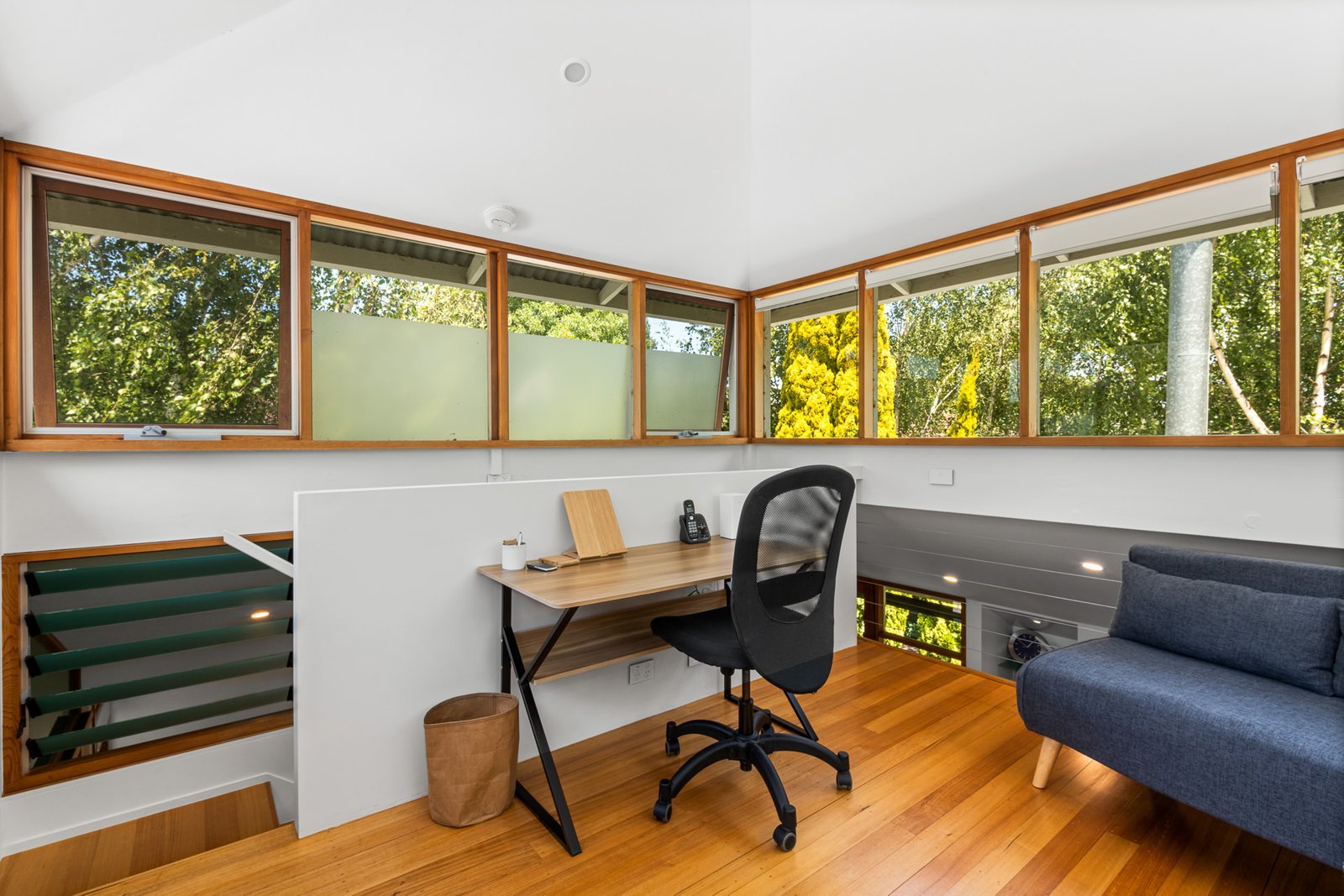 - Upstairs mezzanine-level study offering a serene workspace with breathtaking views of the treetops, extending further during the winter months.