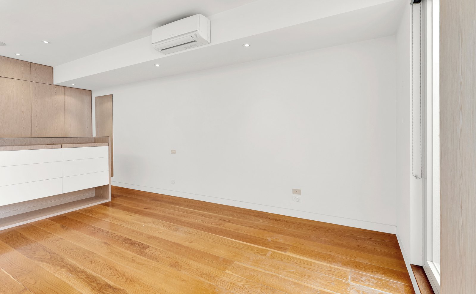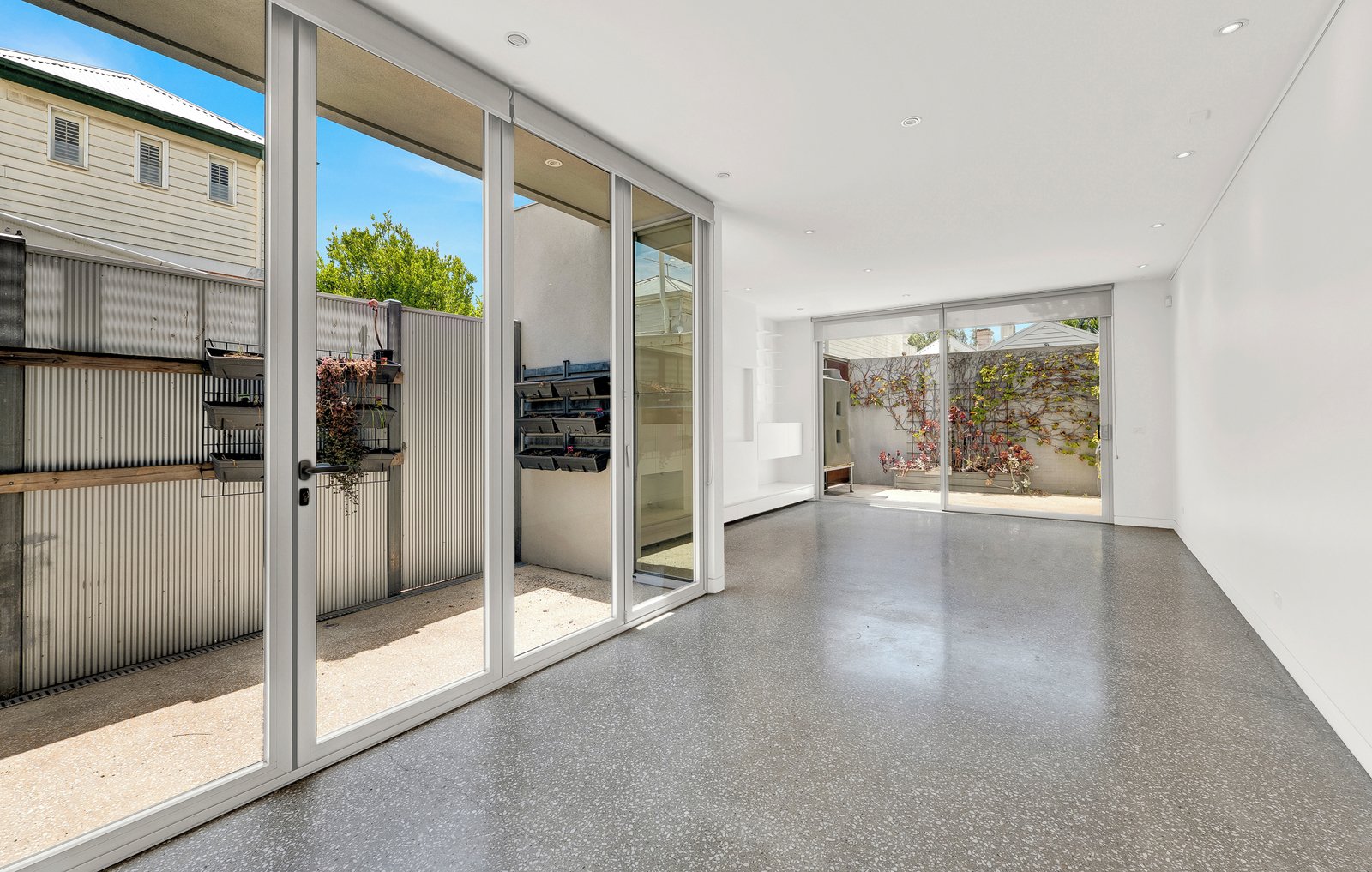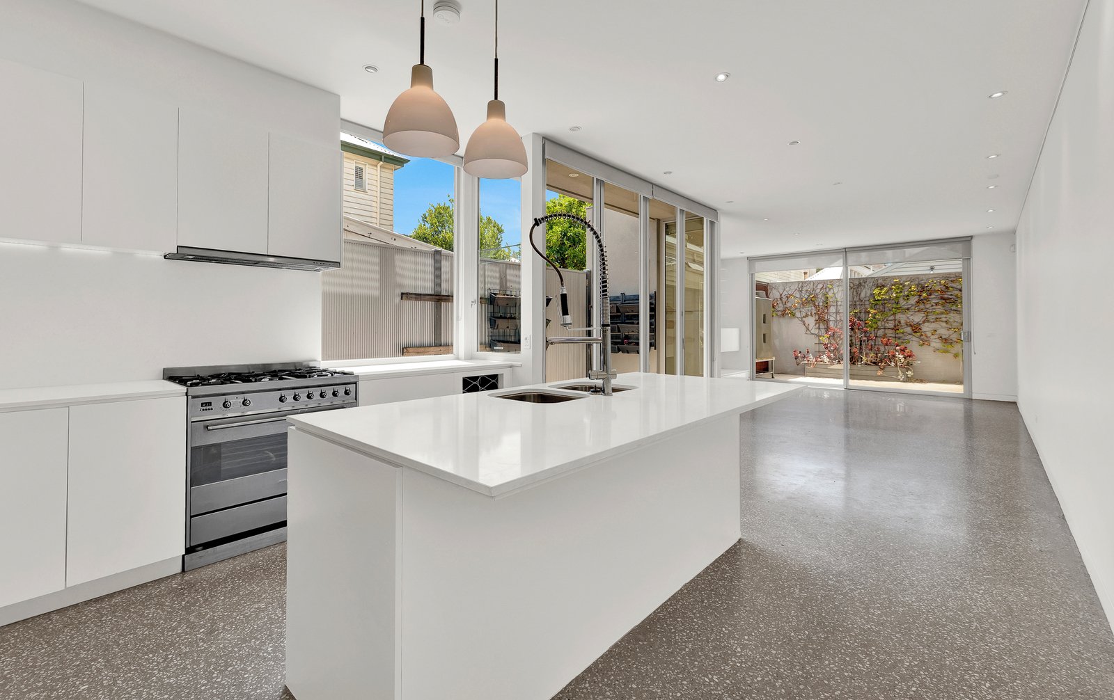 The ground floor features two generous double bedrooms with built-in robes, a sleek modern bathroom, and a designer kitchen that flows effortlessly into a sun-drenched family living area. Polished concrete floors add a sophisticated edge, opening directly onto a private outdoor entertaining space.