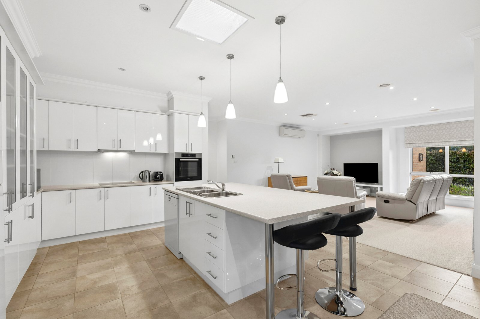 The heart of the home is an open plan kitchen, dining and living area, offering ample space to gather with the family. The quality kitchen features a large island bench, high end Miele appliances including a 600mm oven, induction cooktop, rangehood and dishwasher, generous storage provisions, a skylight, and elegant pendant lighting. The dining area connects with a north facing sunroom, providing a peaceful space to relax with a tranquil garden vista.
