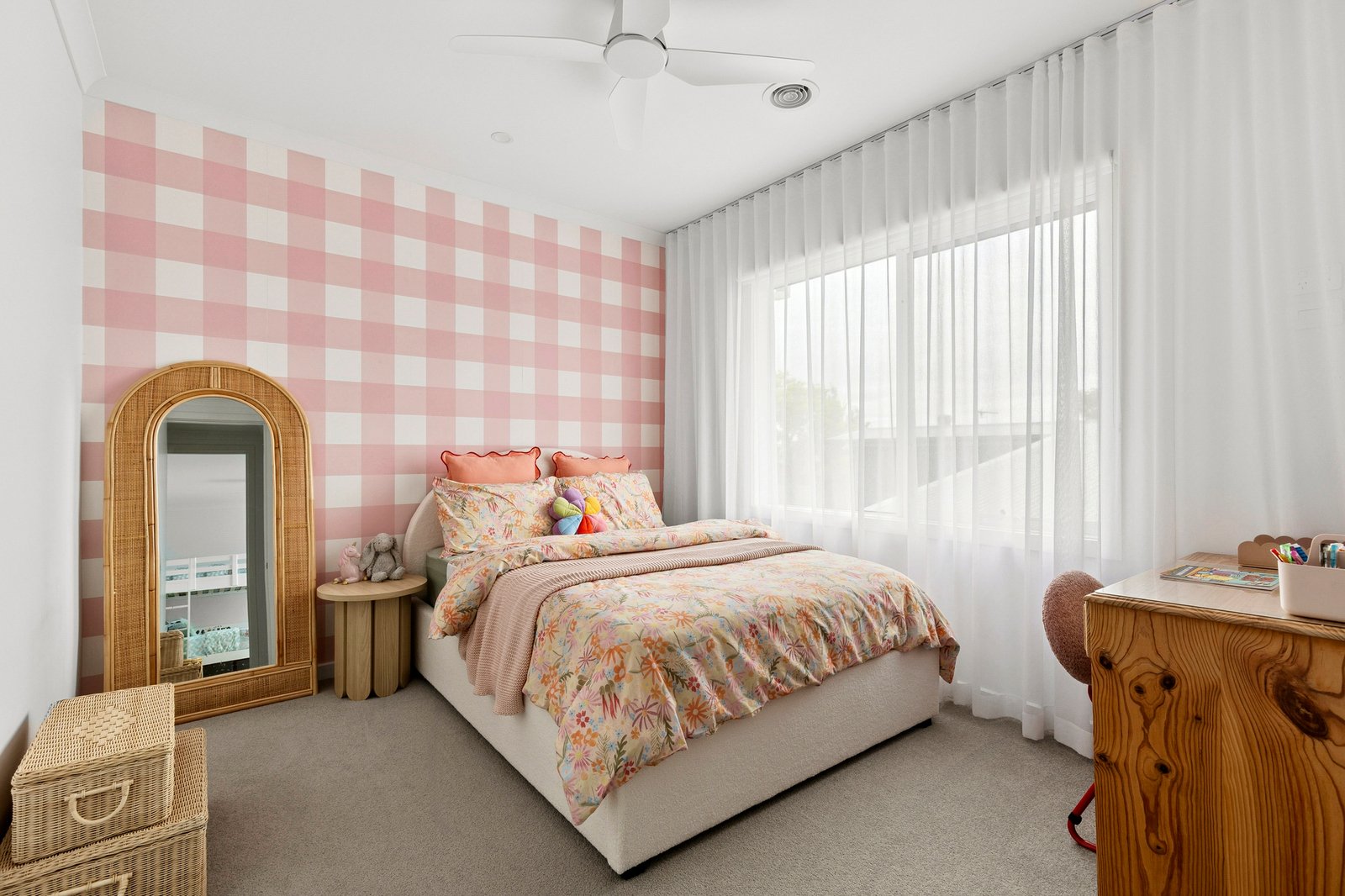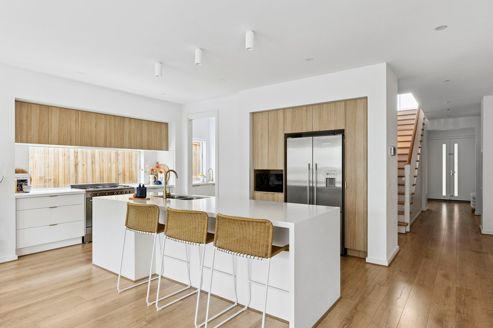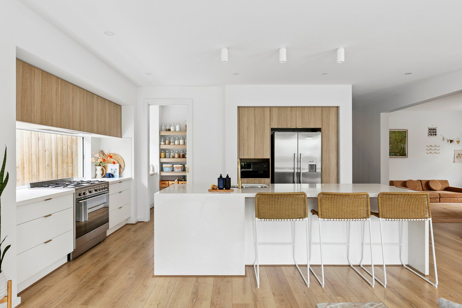 Tiered landscaping complements the refined two-storey façade, introducing the sophisticated style of the home. Inside, a wide central hallway showcases high square set ceilings and beautiful hybrid timber floors leading you through to the light-filled heart of the home. The open plan kitchen, dining and living area features elegant floor to ceiling sheers, VJ panelling, statement lighting and custom joinery offering both style and functionality. The high-end kitchen is finished in stone benchtops, with sleek cabinetry, a 900mm Smeg oven and cooktop, Asko dishwasher, stunning penny round tile splashback, endless storage, and a butler’s pantry with second sink. Glass sliders open up from the living area to the alfresco, allowing for effortless indoor-outdoor living and entertaining.