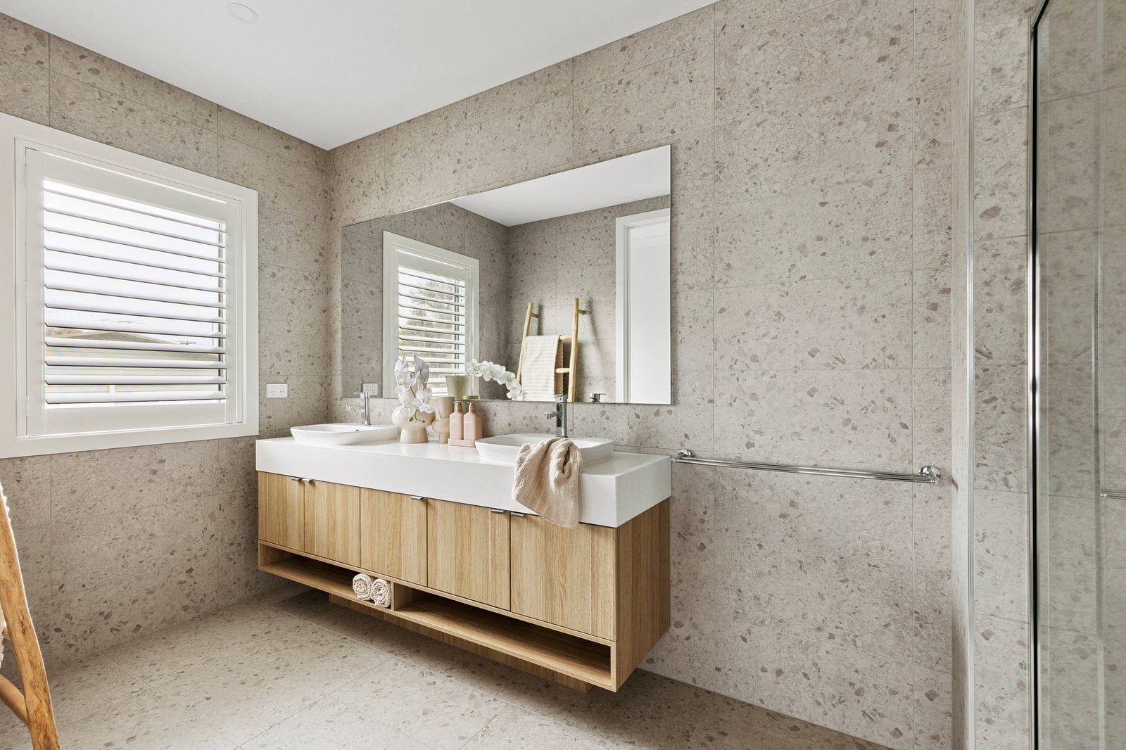 The luxurious main bedroom is positioned upstairs, taking full advantage of the views, featuring generous walk-in robes and a tastefully presented ensuite finished in floor to ceiling tiles, with stone-topped double vanity, spacious shower, and a separate wc. Three further bedrooms on this level all include walk-in robes, one with direct access to the two-way family bathroom. A fifth bedroom on the ground floor features walk-in robes and an ensuite, perfect for a guest room or teenager’s retreat.