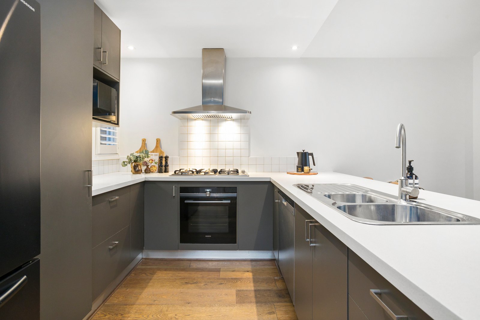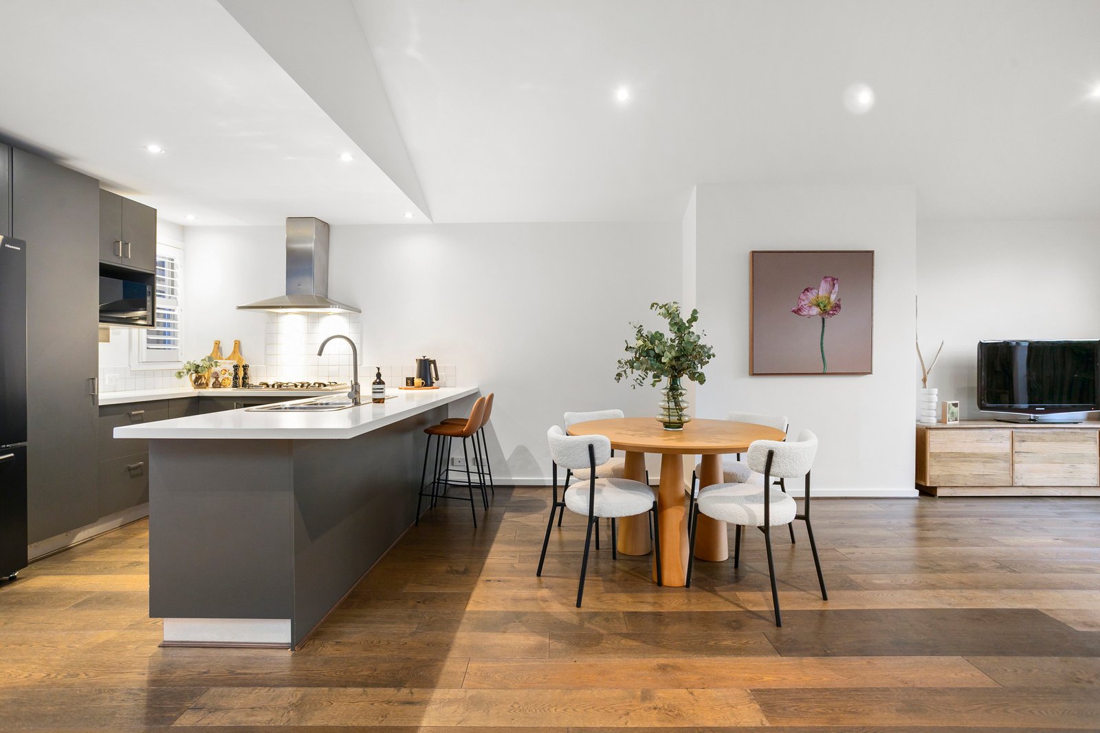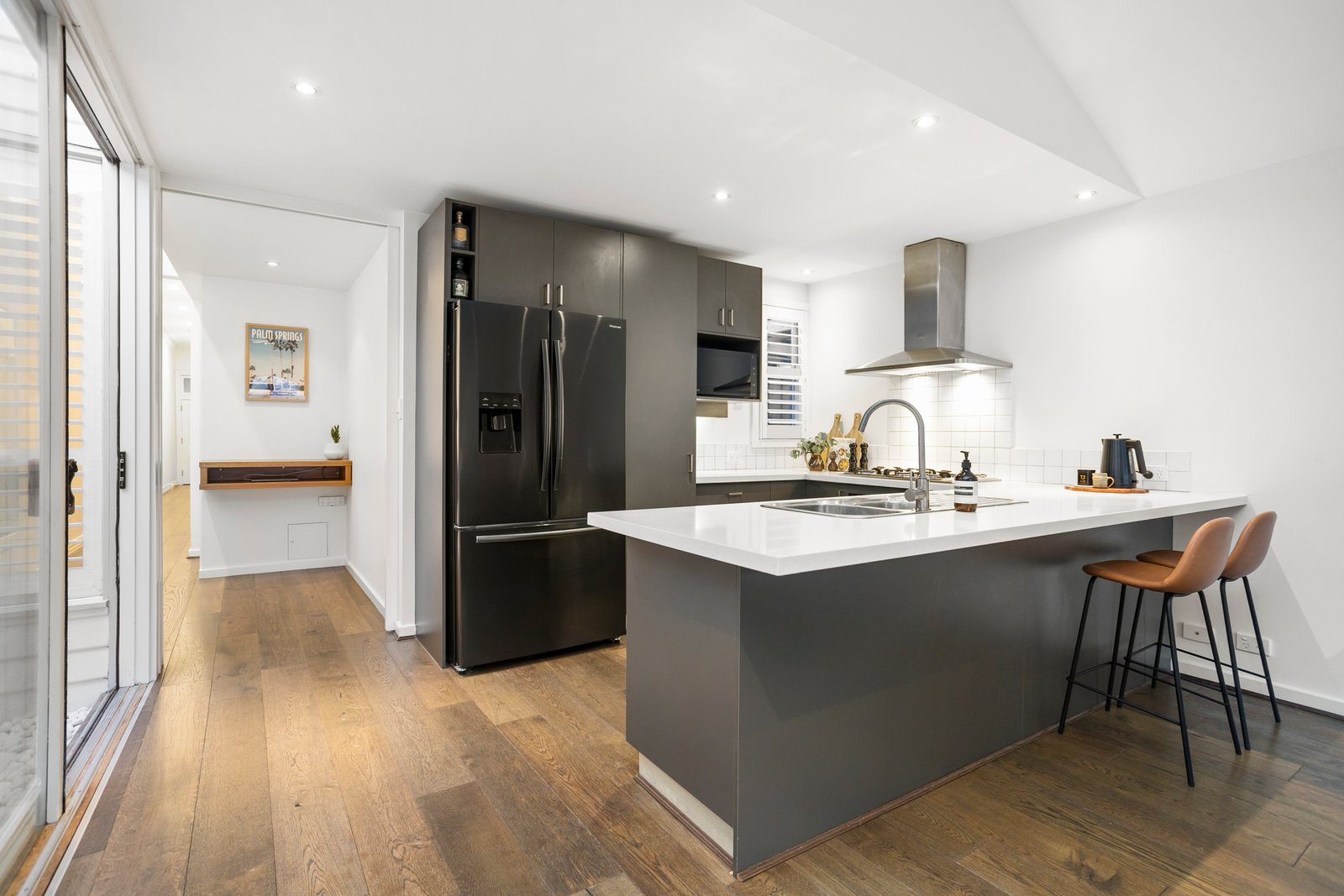 The kitchen itself is crisp and contemporary, featuring white stone benchtops and premium European appliances – practical, stylish and perfectly in tune with the home’s overall aesthetic.