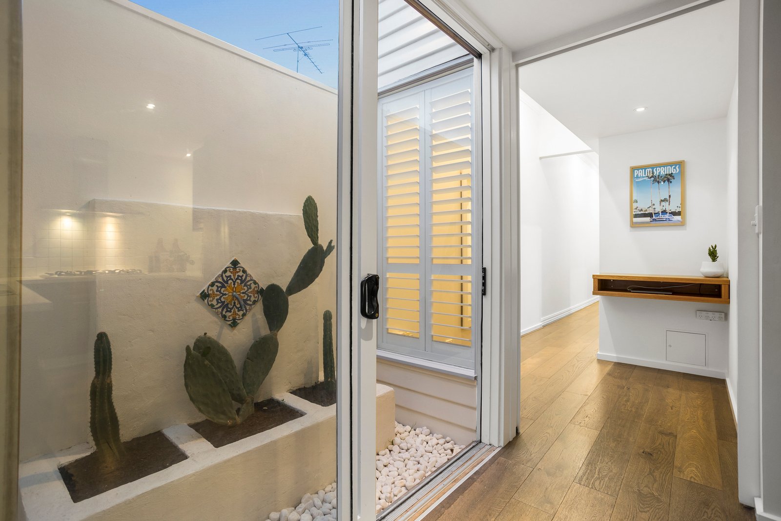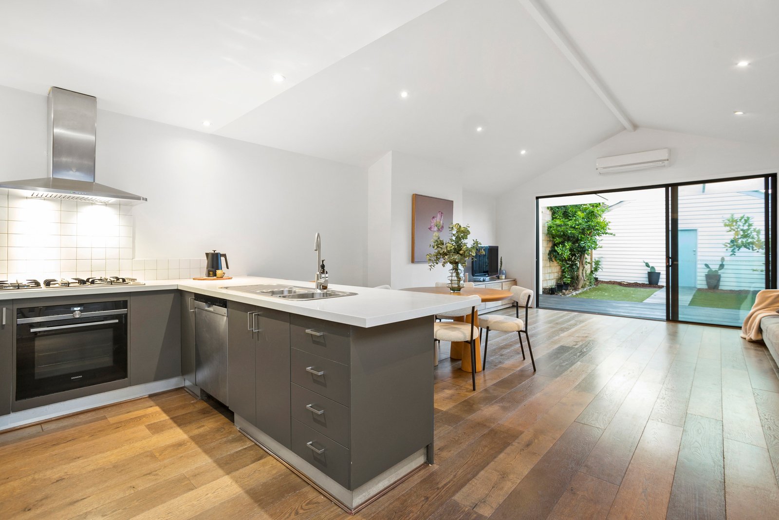 At the rear, the home opens into a stunning modern extension where a soaring pitched ceiling adds architectural drama to the open-plan kitchen, dining and living zone. Bathed in natural light, this space is designed for everyday living and relaxed entertaining, flowing seamlessly to a decked outdoor area and low-maintenance backyard. Framing the outdoors is a thoughtfully curated edible garden, complete with lemon, lime and orange trees and a flowing grapevine that softens the space and invites seasonal harvesting. An internal courtyard with a sculptural cactus garden sits just off the kitchen, adding a unique and unexpected design element.