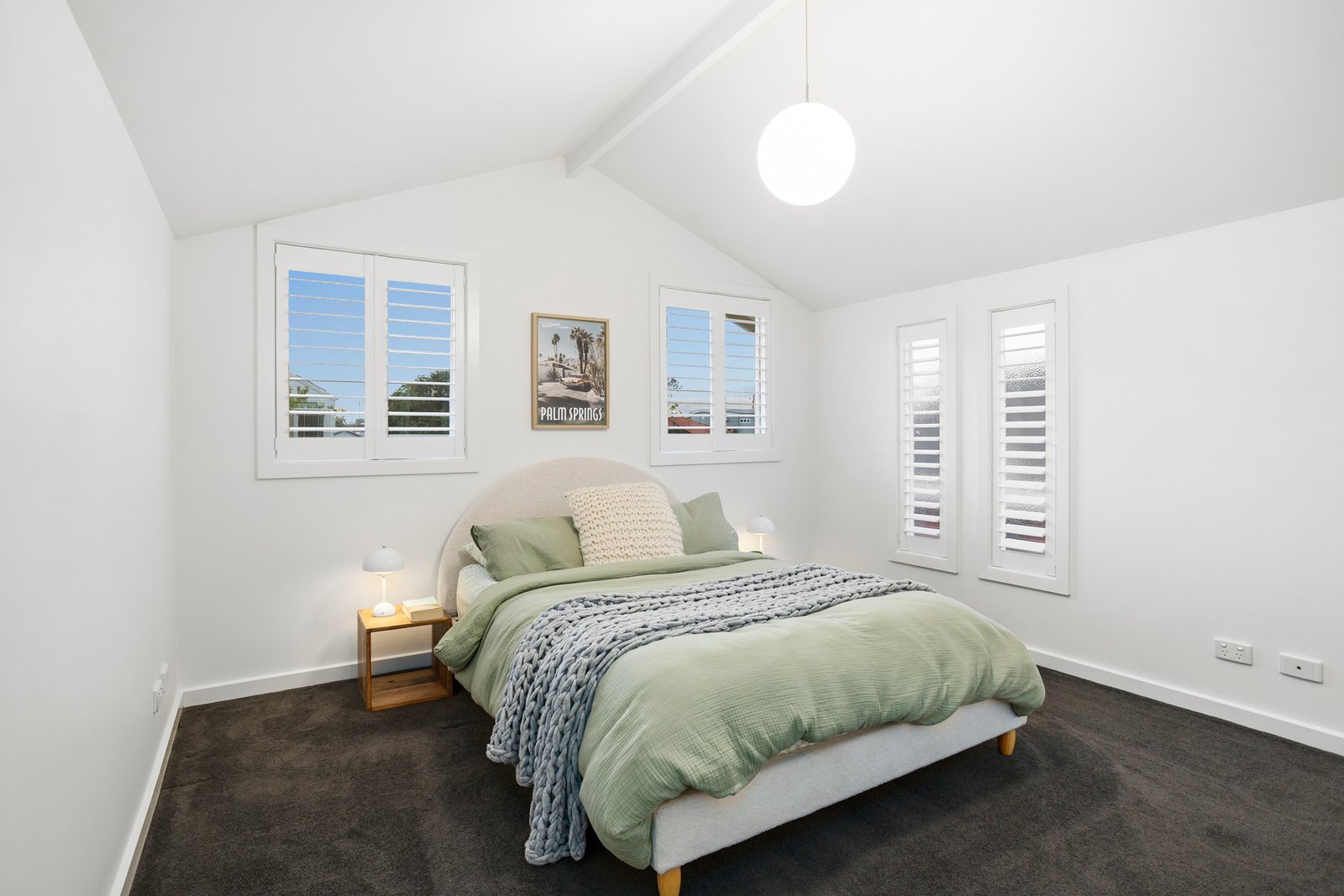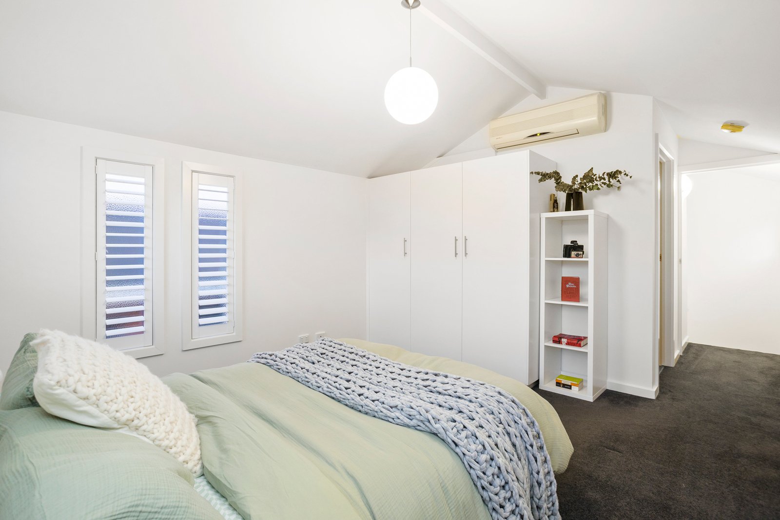 The upper level is dedicated entirely to the main bedroom retreat. With pitched ceilings, soft carpet underfoot, built-in wardrobes and an ensuite, this space is filled with beautiful natural light through four large windows, all finished with plantation shutters for privacy and comfort.