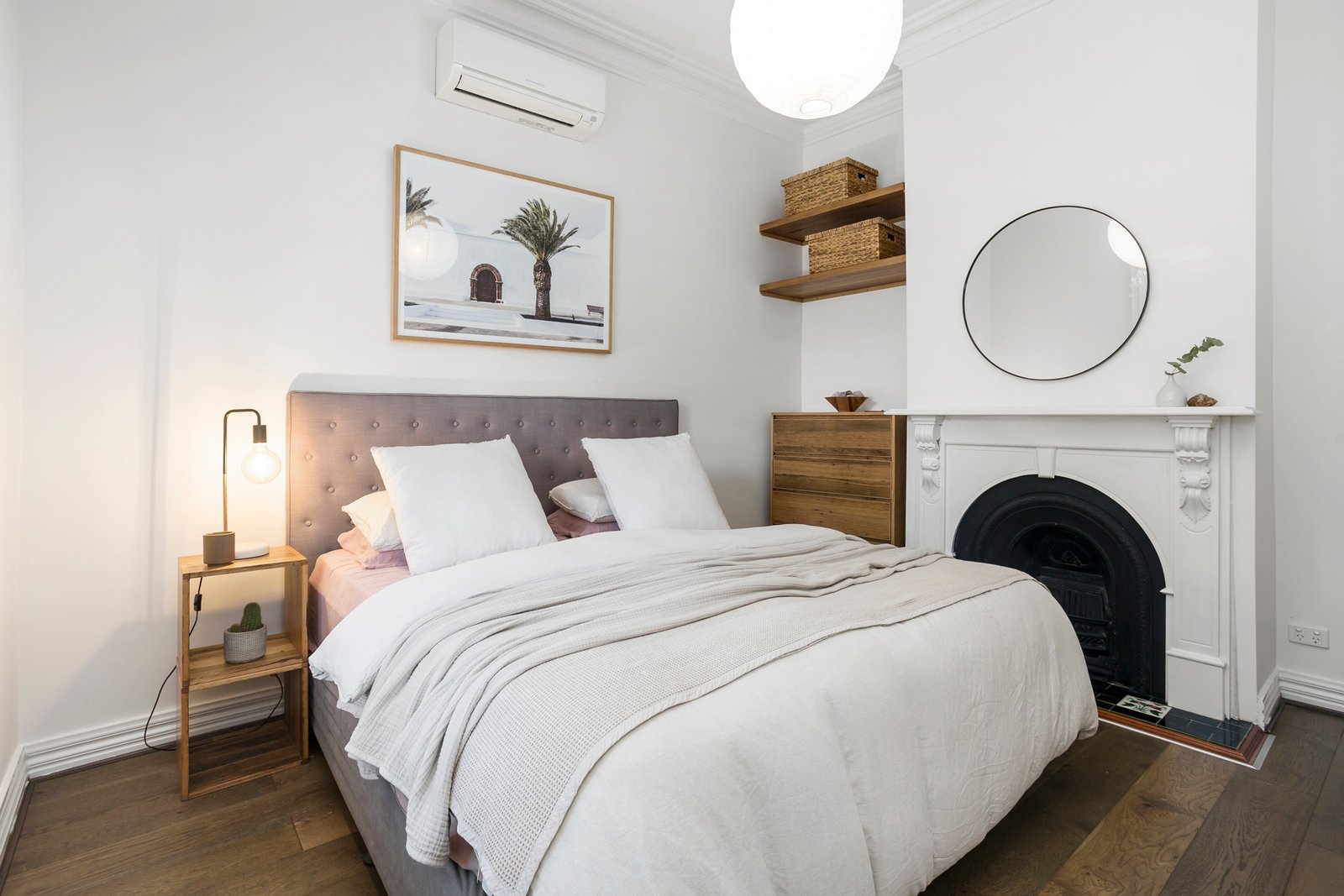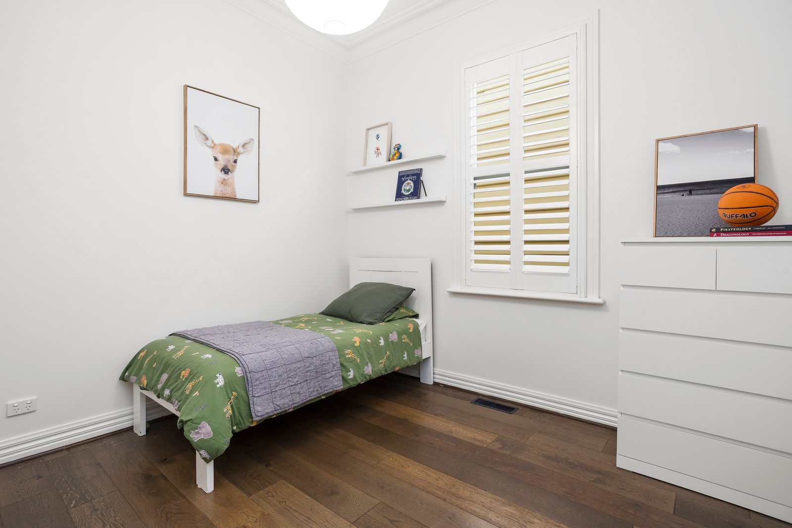 Inside, timber floorboards guide you along the central hallway, with three inviting bedrooms positioned to the left. The front bedroom is rich in character, featuring an ornamental fireplace, built-in robes, plantation shutters and split-system heating and cooling. The second bedroom mirrors this sense of refinement with timber floors, built-in robes and shutters, while the third – slightly smaller in scale – offers a charming personality of its own with a beautiful floral feature wall.