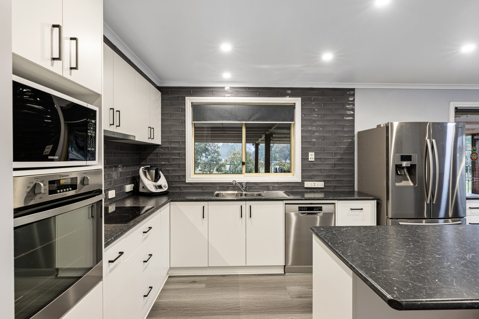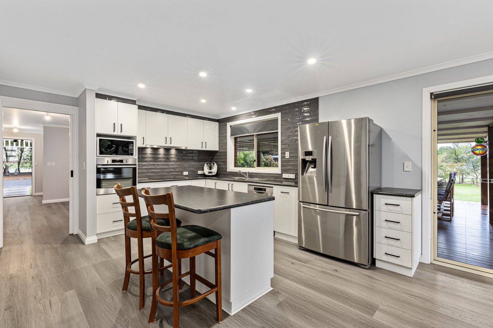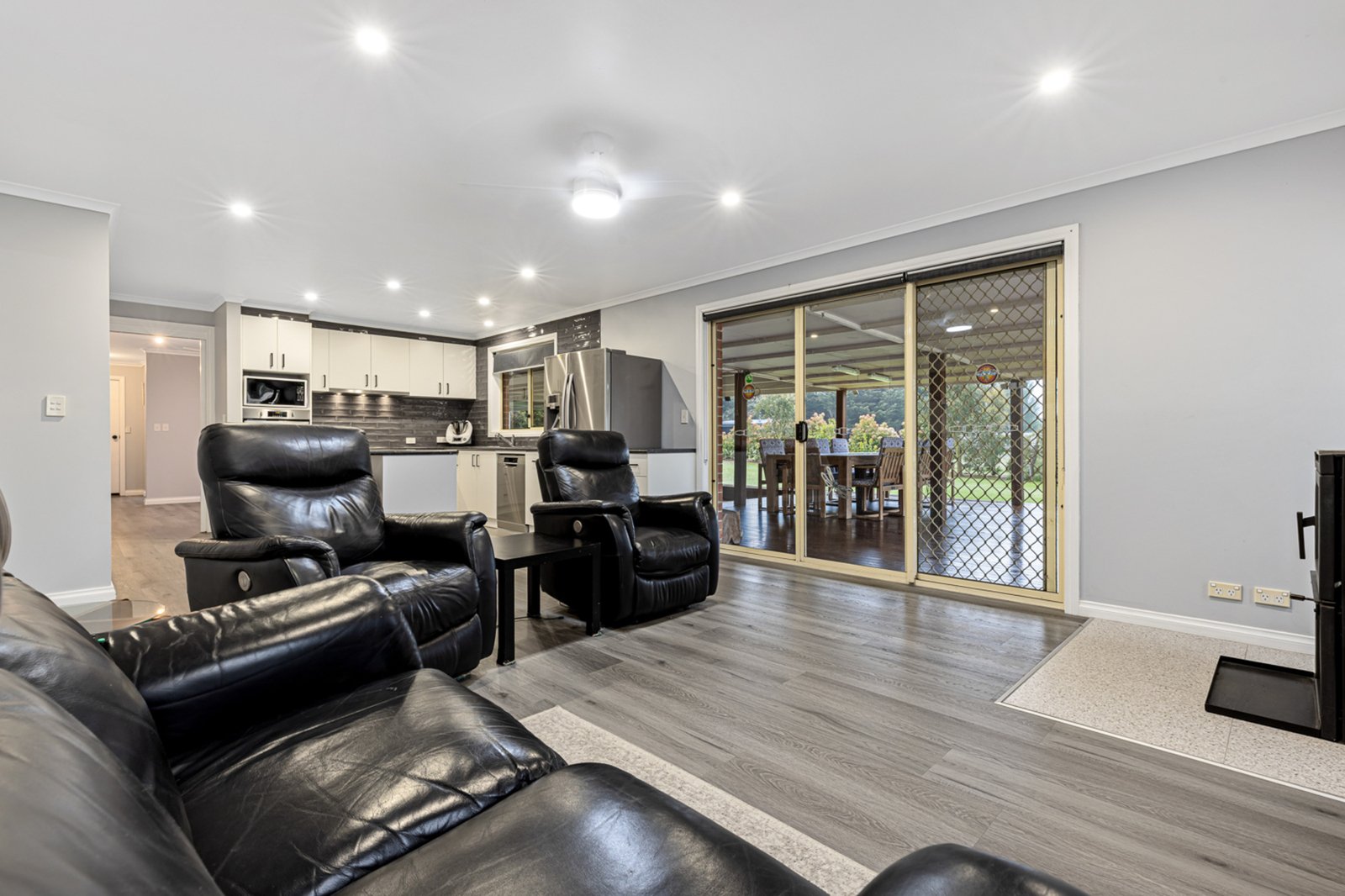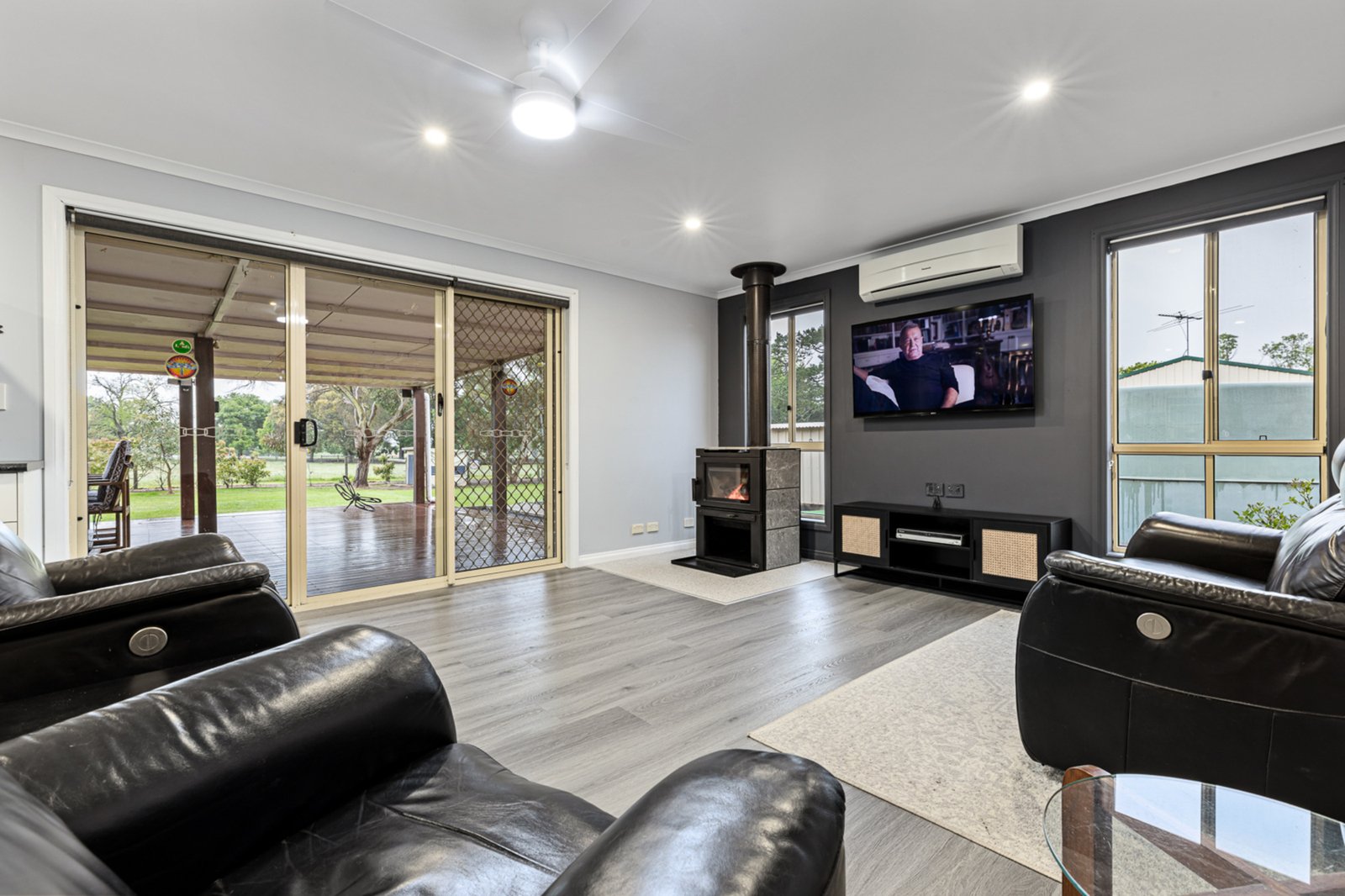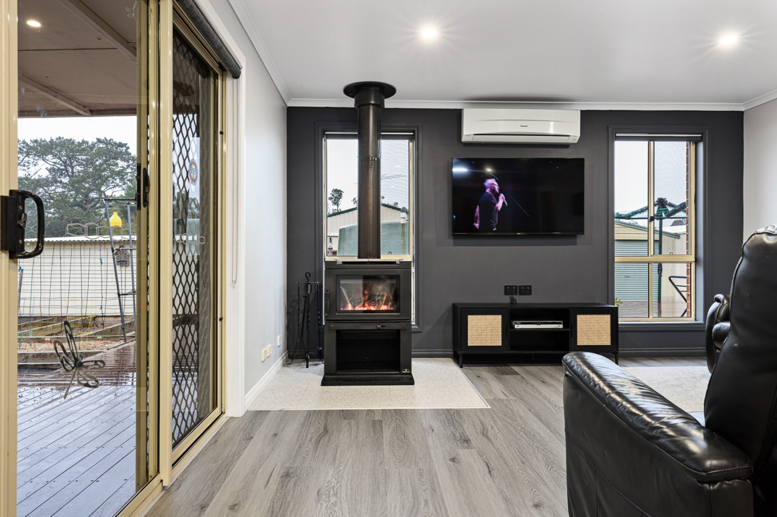 Inside, the home is warm and welcoming with two generous living areas, perfect for families or those who enjoy entertaining. The main living space is centred around a cosy wood fire, creating a relaxed atmosphere for cooler months, while large windows allow natural light to flow throughout. The kitchen is well positioned to service both living and dining areas, offering practical bench space and storage, making everyday living and hosting effortless.