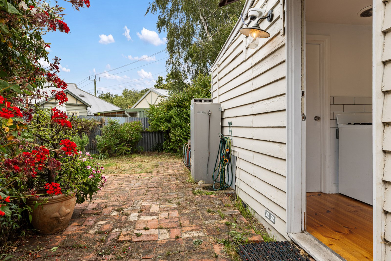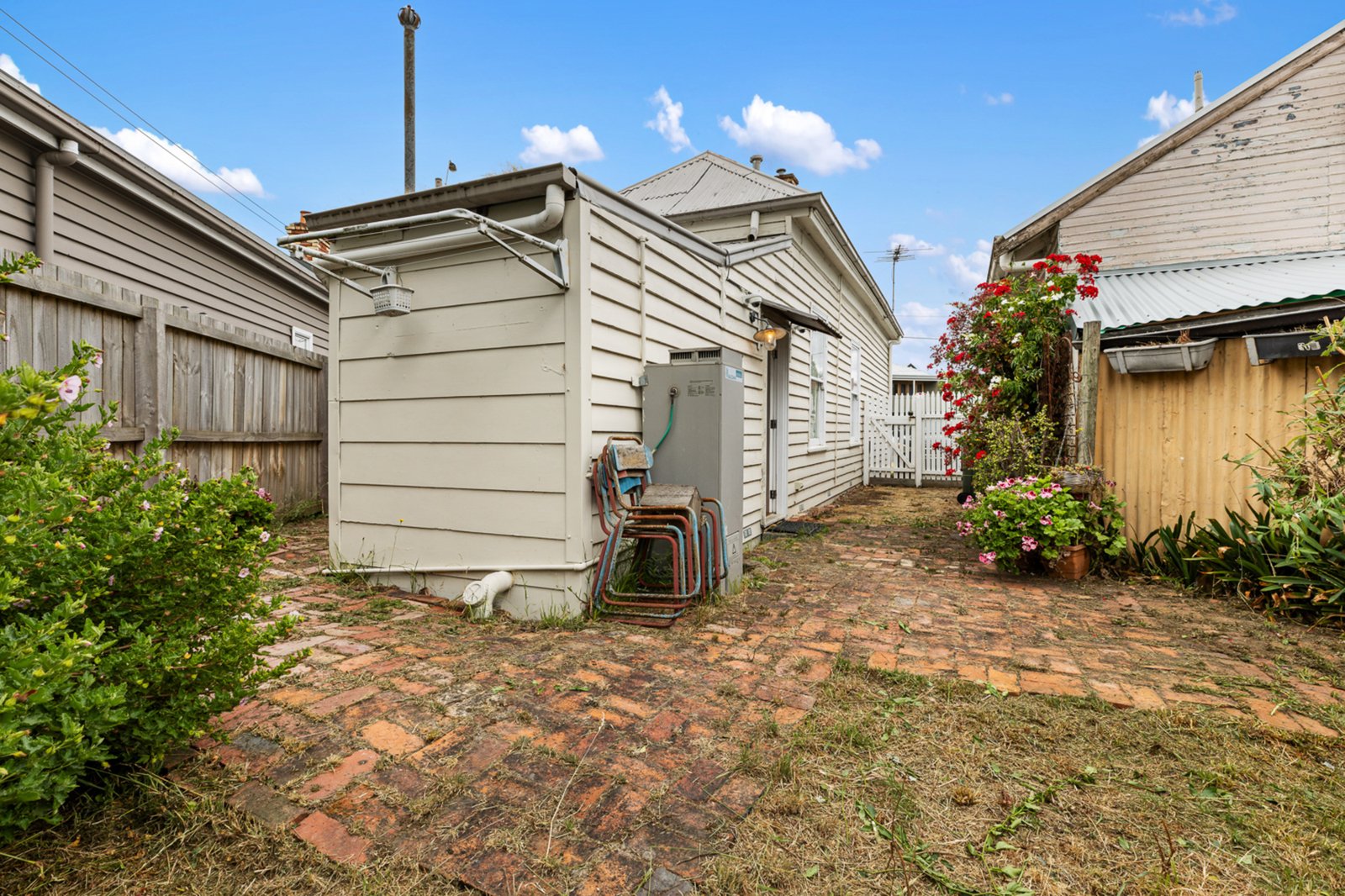 Outside, a private driveway runs alongside the home, providing secure off-street parking and direct access through to the rear brickpaved courtyard. This low-maintenance outdoor space offers a private setting for entertaining or relaxing, with secure fencing and excellent functionality rarely found in homes of this era.